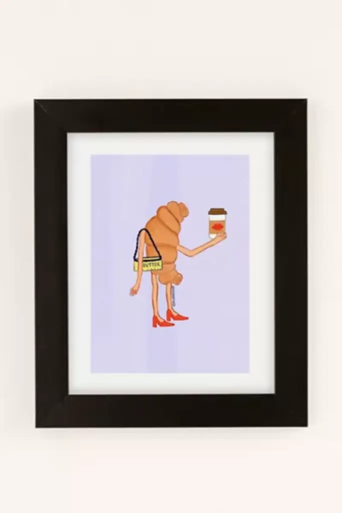 Art print by theebouffants featuring a chic croissant character. Printed on archival paper made from cotton pressed in Italian mills, this high-quality art print is available in sizes and frames just right for your space. First select your frame (or go frameless), then select your size. **About the Frames** \- The exact width of each frame may vary slightly \- All frames are manufactured in the US \- Matte frames are durable poly \- Wood frames are recycled wood \- All are fitted with protective plexiglass \- Finished with wood moldings, archival backer and protective bumpers **Size** \- Available in multiple sizes \- Use the Size Guides to find the size that fits your space **Content + Care** \- Wipe clean \- Made in the USA