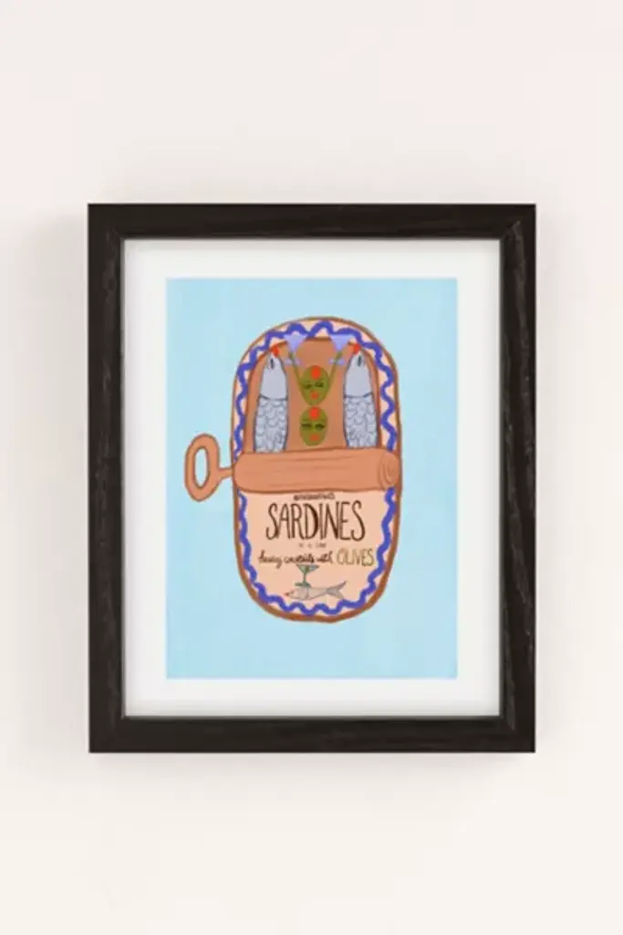 Art print by theebouffants featuring a sardine and olive tin. Printed on archival paper made from cotton pressed in Italian mills, this high-quality art print is available in sizes and frames just right for your space. First select your frame (or go frameless), then select your size. **About the Frames** \- The exact width of each frame may vary slightly \- All frames are manufactured in the US \- Matte frames are durable poly \- Wood frames are recycled wood \- All are fitted with protective plexiglass \- Finished with wood moldings, archival backer and protective bumpers **Size** \- Available in multiple sizes \- Use the Size Guides to find the size that fits your space **Content + Care** \- Wipe clean \- Made in the USA