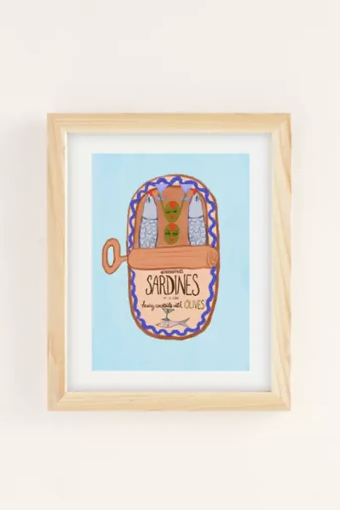 Art print by theebouffants featuring a sardine and olive tin. Printed on archival paper made from cotton pressed in Italian mills, this high-quality art print is available in sizes and frames just right for your space. First select your frame (or go frameless), then select your size. **About the Frames** \- The exact width of each frame may vary slightly \- All frames are manufactured in the US \- Matte frames are durable poly \- Wood frames are recycled wood \- All are fitted with protective plexiglass \- Finished with wood moldings, archival backer and protective bumpers **Size** \- Available in multiple sizes \- Use the Size Guides to find the size that fits your space **Content + Care** \- Wipe clean \- Made in the USA