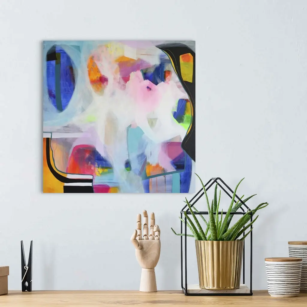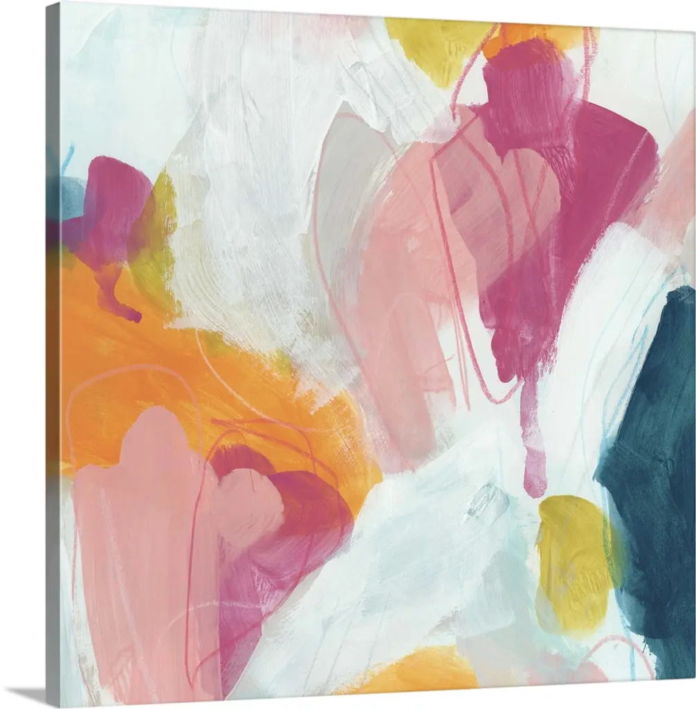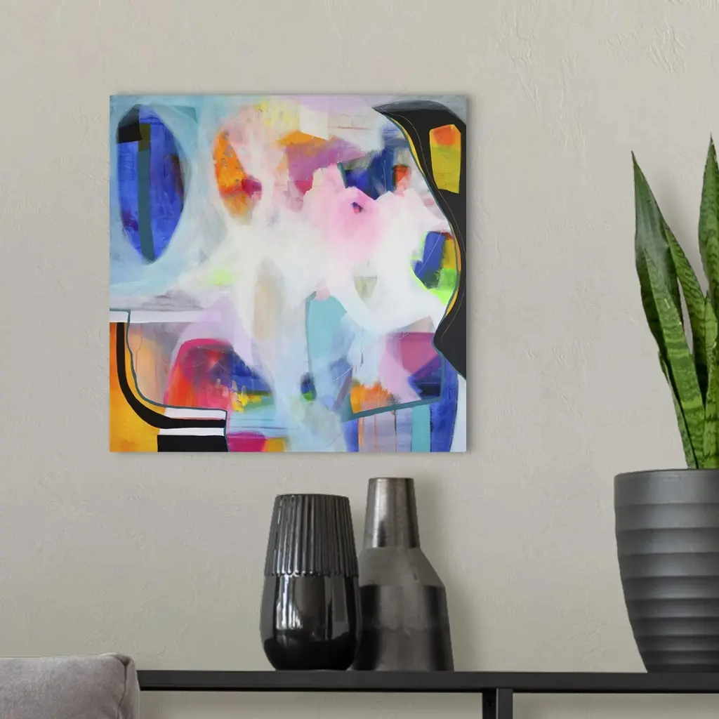 Contemporary abstract artwork in bright, cheerful shades of blue, pink, red, and orange.