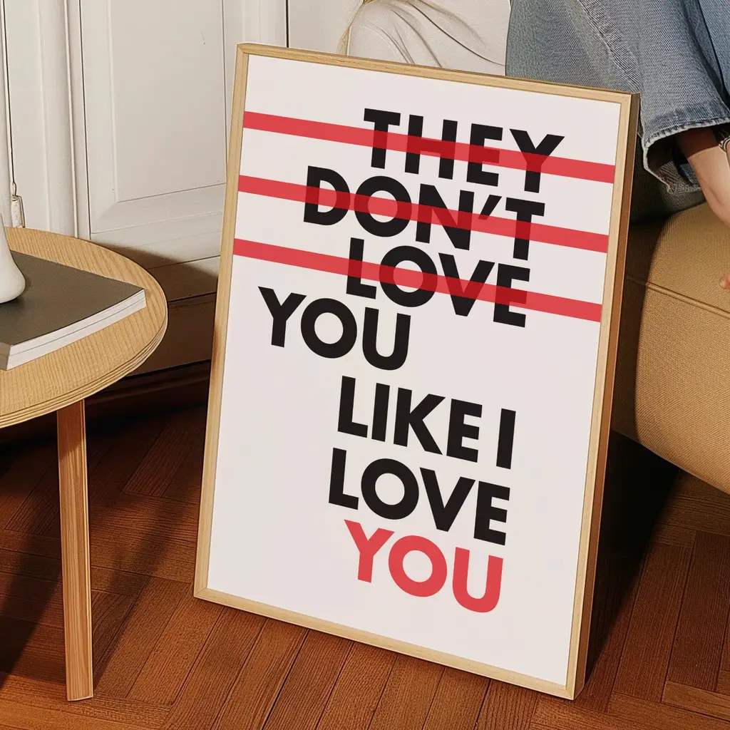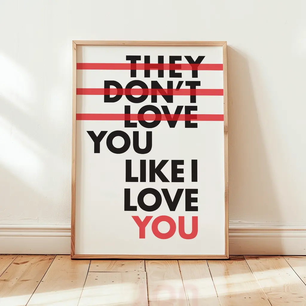 They Don't Love you Like I Love You Art PrintSold without frameGiclée printed on Munken pure smooth cream paper which is certified by the Rainforest Alliance Program for FSC® Standards. All A4 & A3 prints are packed in eco friendly 100% biodegradable poly bags A2 prints are shipped in cardboard tubes.Designed by Fanclub owners and sisters, Johanna and Felicity in our UK studio.