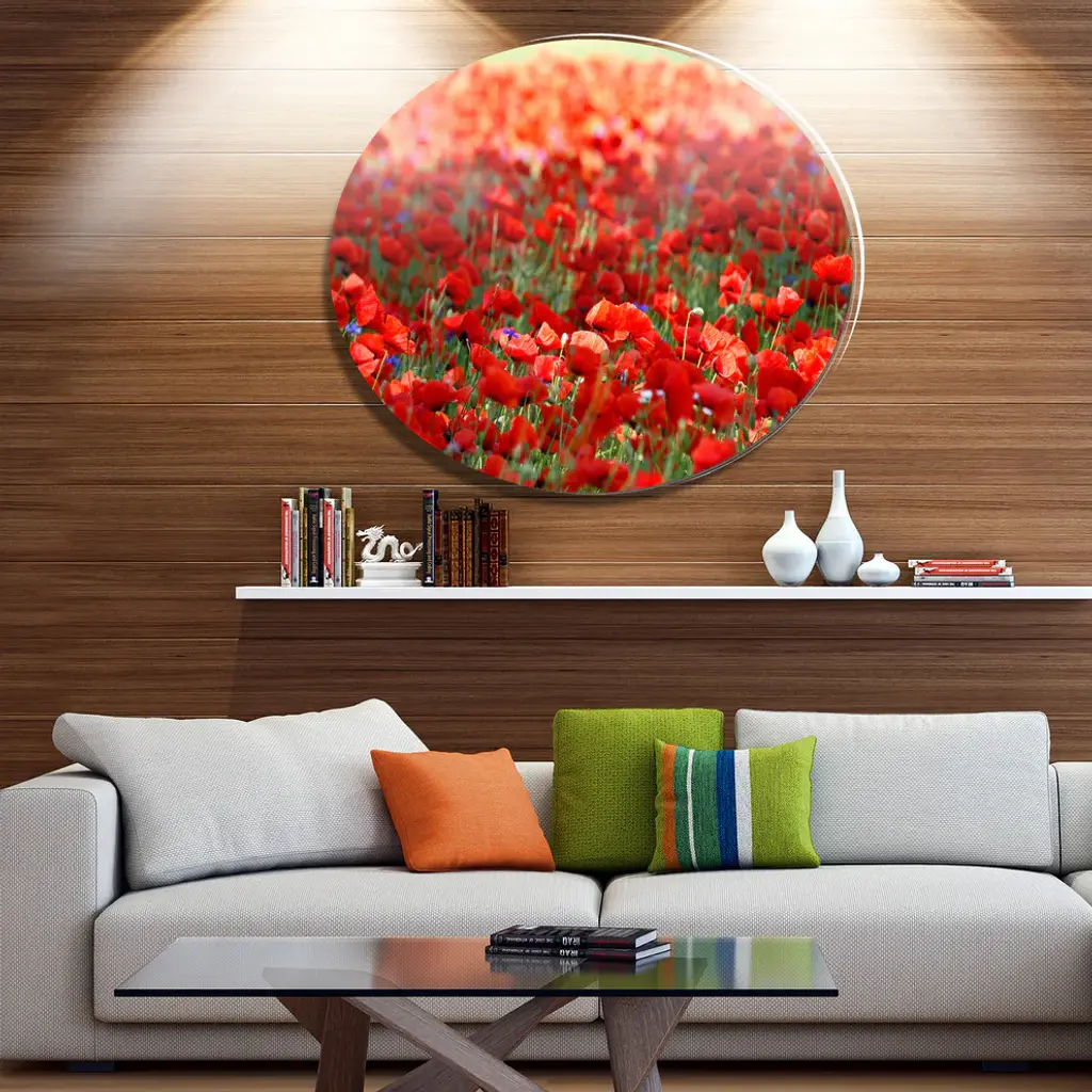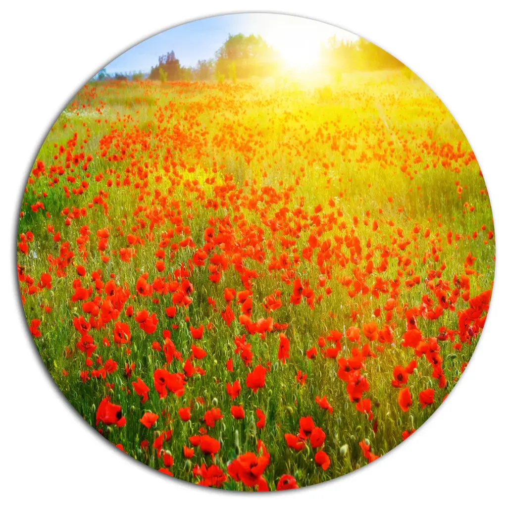 Bring Contemporary Abstraction to your home with this large Circle Metal wall art. This Thick Red Poppy Flower Field Metal Artwork makes it the focal point of any room or office. - White Gloss Coating ensures colors are extra vibrant with light reflection.- Aluminum grade Sheet Metal with 1 inch mounting frame on the back giving the illusion that the artwork is floating on the wall..- Mounting Brackets are included along with instructions.- High Quality Digital images are created directly into a glossy aluminum panel producing a stunning and captivating print into the glossy finish of the metal.- Water, Fire and Scratch resistant HD Aluminum panels.- Looks better than any photo paper and guaranteed to last at least 20 years- Easy to clean with a microfiber cloth. Colors are far superior to regular Canvas Art. - Easy to Hang