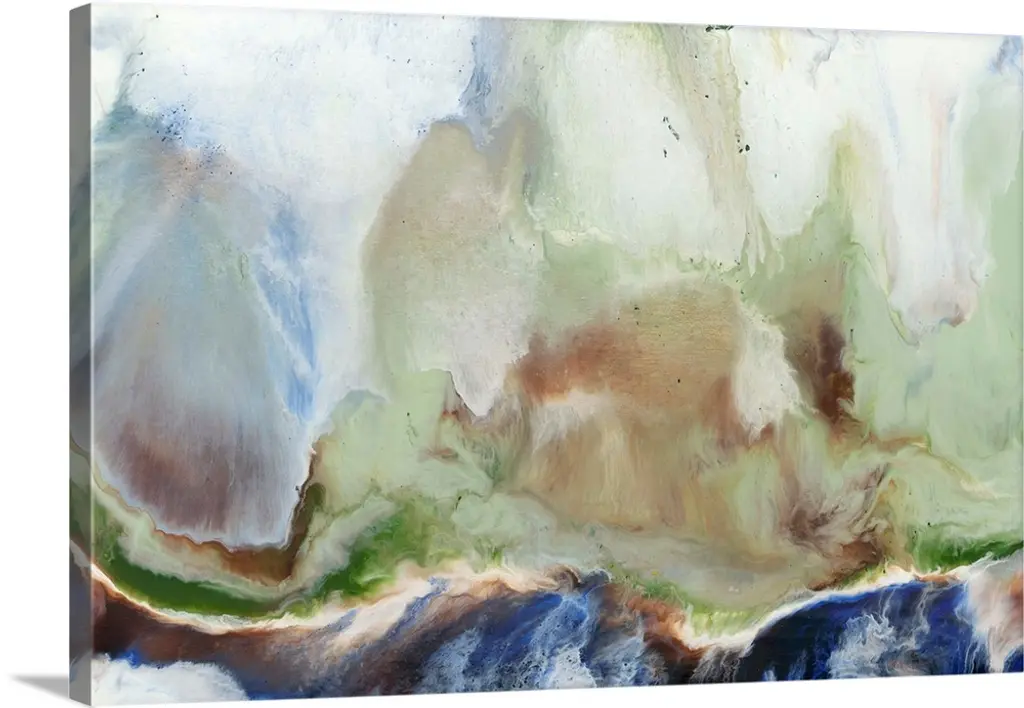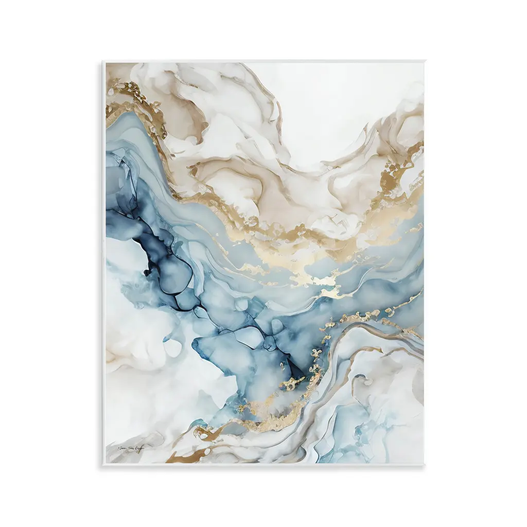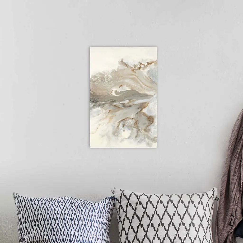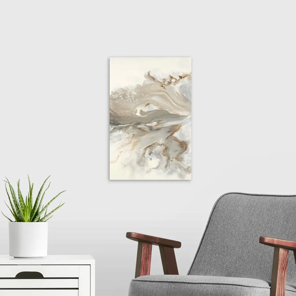 Abstract painting with brown, gold, and gray hues marbling together on a white background.