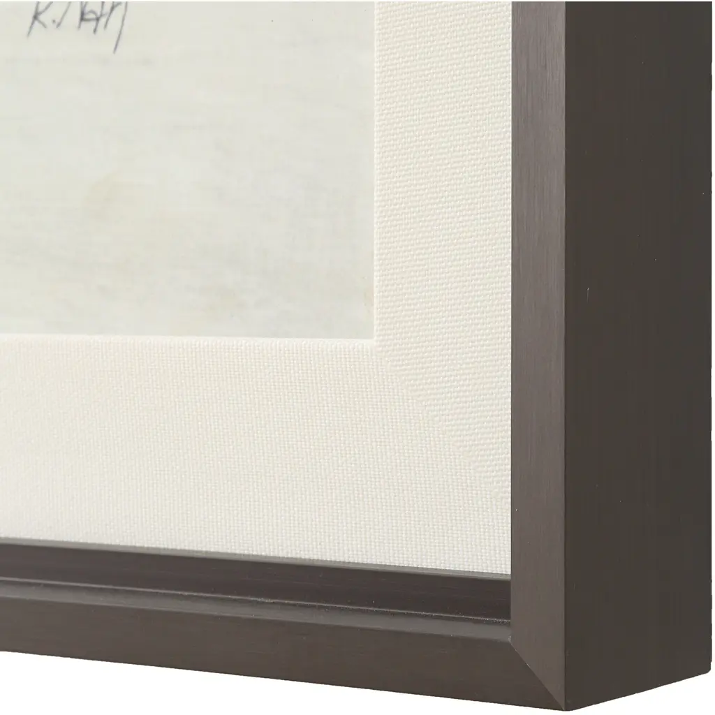 Thinking Of You Framed Prints Features A Moody Abstract Landscape In Shades Of Greige, Navy, And Black, With Pops Of Eggplant. Each Piece Is Elegantly Surrounded By A Bronze Aluminum Frame And Accented By A White Linen Liner. Artwork By K. Nari.