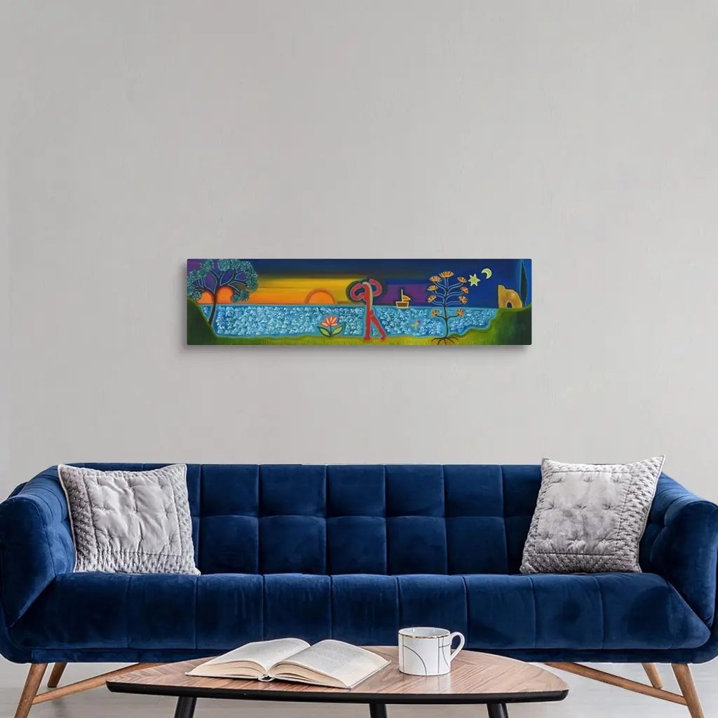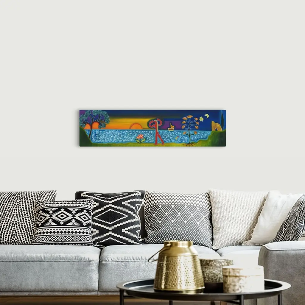 Contemporary painting of a person walking along the ocean at sunset.