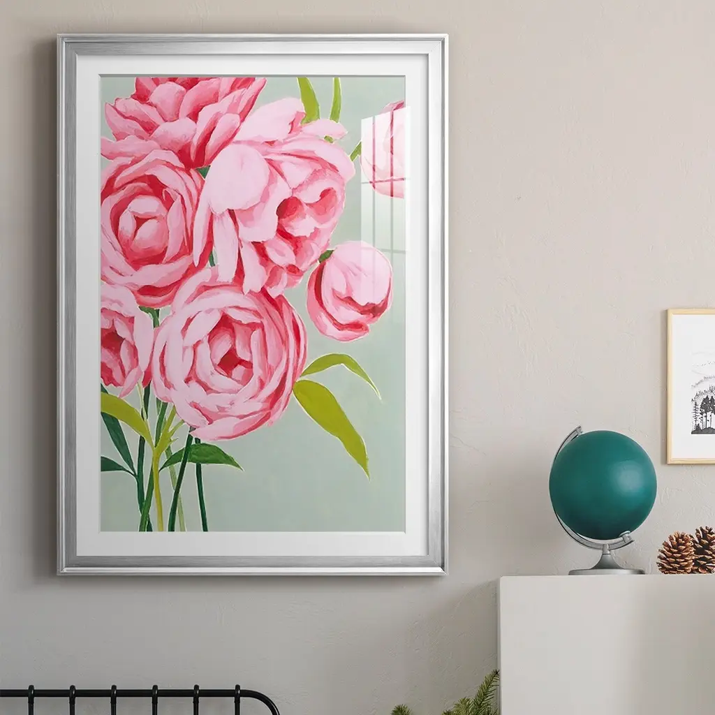 This Year's Peonies II Premium Framed Print - Ready to Hang A Premium Framed Print created to last. Framed in distressed wood and available in an array of sizes and colors Featuring a beveled a solid wood stretcher bar, each piece comes ready to hand 4 SIZES AVAILABLE 30.5''X42.5'' - Overall Size 26.5'X36.5'' - Overall Size 22.5''x30.5'' - Overall Size 18.5''x24.5'' - Overall Size Each piece is made to order. Each piece comes with hanging hardware. Made in the USA Ready to Hang Giclee Paper Print Acrylic Glass Beveled Matt Board