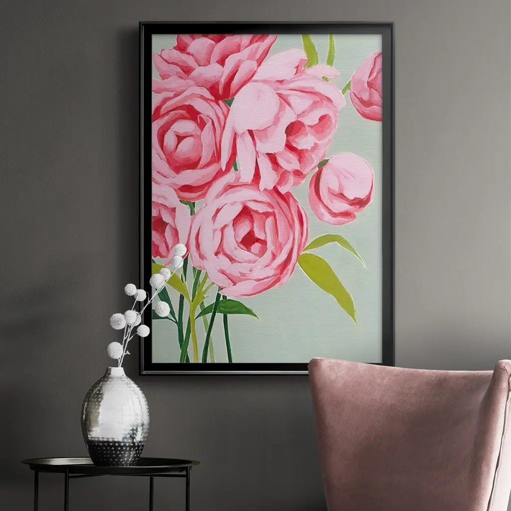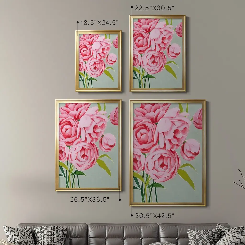 This Year's Peonies II Premium Framed Print - Ready to Hang A Premium Framed Print created to last. Framed in distressed wood and available in an array of sizes and colors Featuring a beveled a solid wood stretcher bar, each piece comes ready to hand 4 SIZES AVAILABLE 30.5''X42.5'' - Overall Size 26.5'X36.5'' - Overall Size 22.5''x30.5'' - Overall Size 18.5''x24.5'' - Overall Size Each piece is made to order. Each piece comes with hanging hardware. Made in the USA Ready to Hang