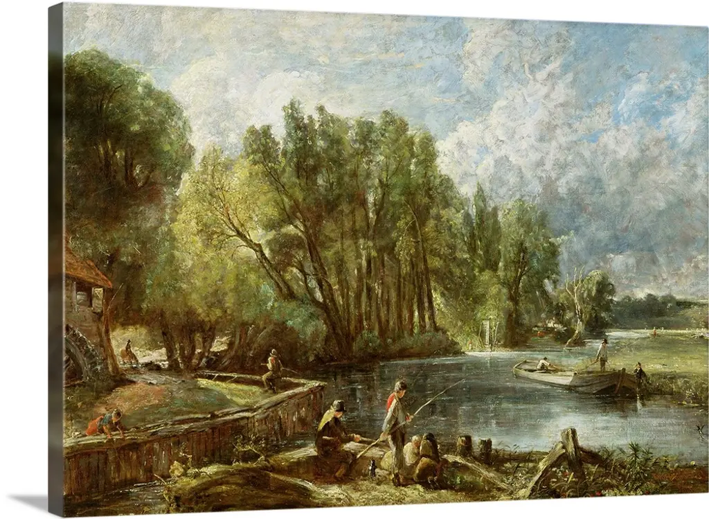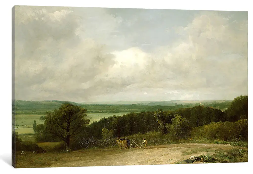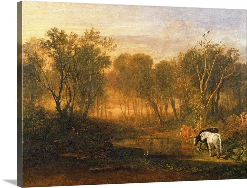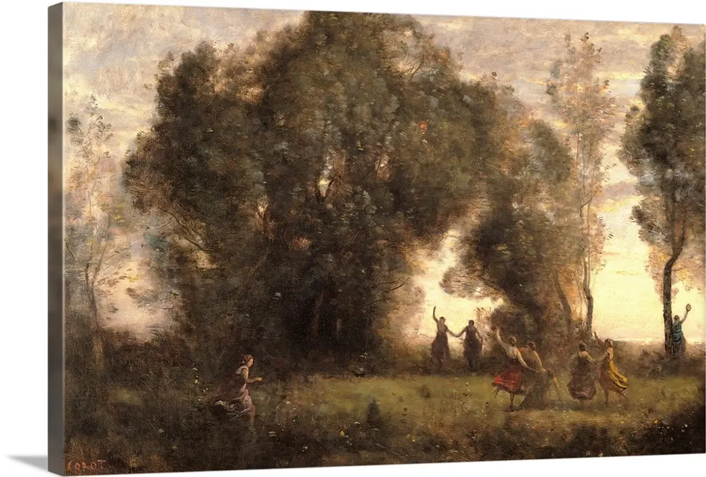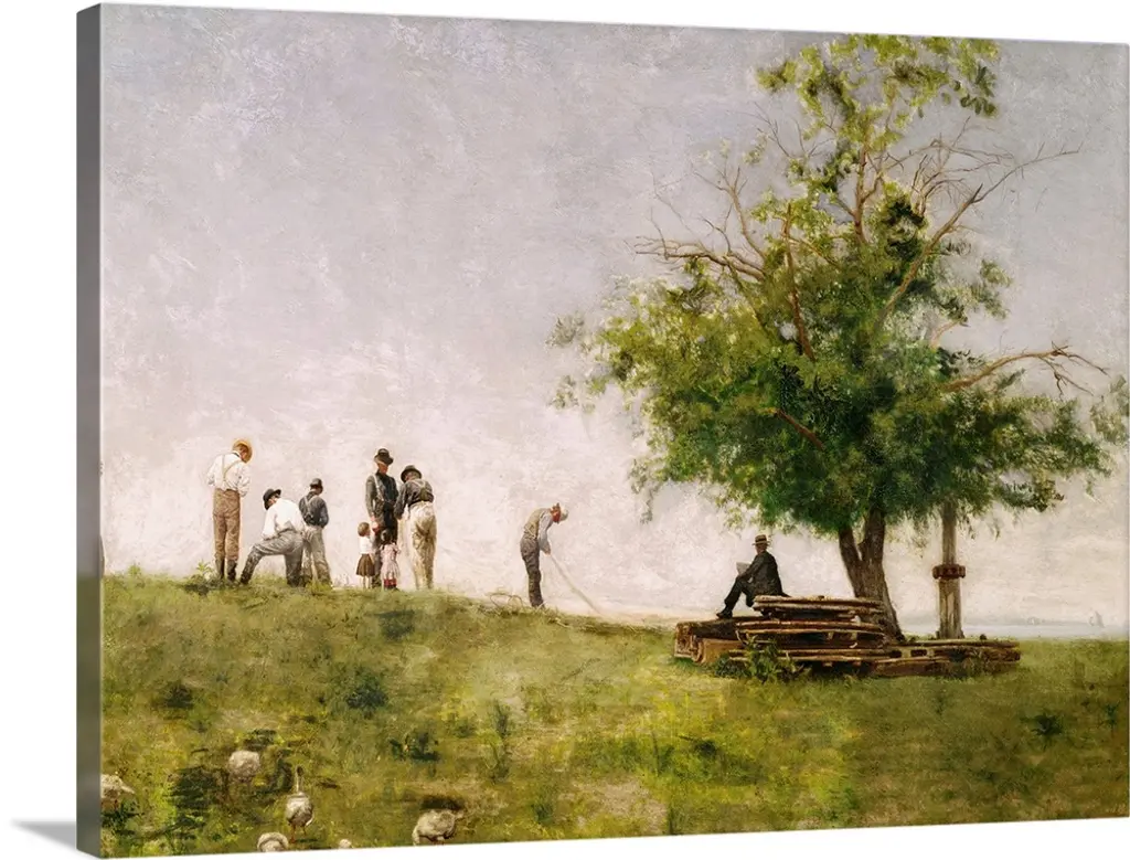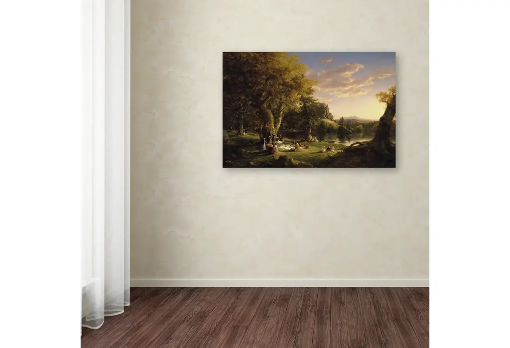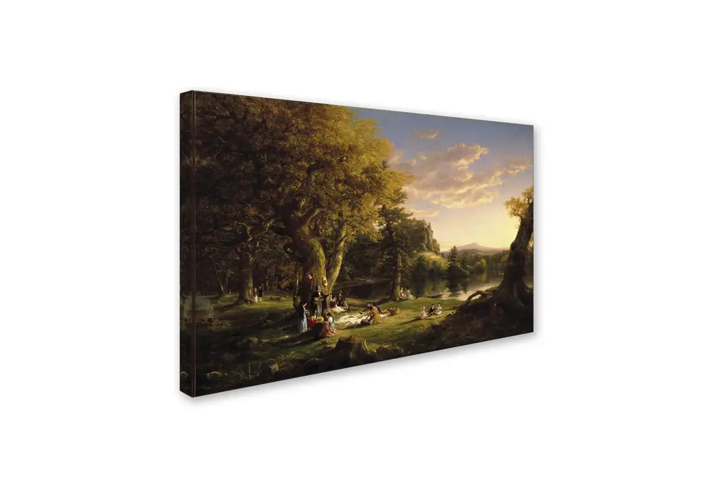 Artist: Thomas ColeSubject: LandscapeStyle: TraditionalProduct Type: Gallery-Wrapped Canvas ArtMade in USAThis ready to hang, gallery-wrapped art piece features a group of people sitting under a tree on the left side of the frame.Thomas Cole was an American artist. He is regarded as the founder of the Hudson River School, an American art movement that flourished in the mid 19th century. Coles work was known for its realistic and detailed portrayal of American landscape and wilderness, which feature themes of romanticism.Giclee (jee-clay) is an advanced printmaking process for creating high quality fine art reproductions. The attainable excellence that Giclee printmaking affords makes the reproduction virtually indistinguishable from the original piece. The result is wide acceptance of Giclee by galleries, museums, and private collectors. Gallery wrap is a method of stretching an artist's canvas so that the canvas wraps around the sides and is secured a hidden, wooden frame. This method of stretching and preparing a canvas allows for a frameless presentation of the finished painting.