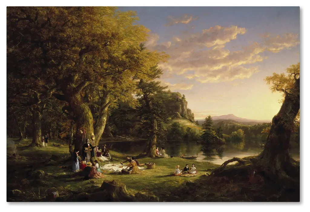 Artist: Thomas ColeSubject: LandscapeStyle: TraditionalProduct Type: Gallery-Wrapped Canvas ArtMade in USAThis ready to hang, gallery-wrapped art piece features a group of people sitting under a tree on the left side of the frame.Thomas Cole was an American artist. He is regarded as the founder of the Hudson River School, an American art movement that flourished in the mid 19th century. Coles work was known for its realistic and detailed portrayal of American landscape and wilderness, which feature themes of romanticism.Giclee (jee-clay) is an advanced printmaking process for creating high quality fine art reproductions. The attainable excellence that Giclee printmaking affords makes the reproduction virtually indistinguishable from the original piece. The result is wide acceptance of Giclee by galleries, museums, and private collectors. Gallery wrap is a method of stretching an artist's canvas so that the canvas wraps around the sides and is secured a hidden, wooden frame. This method of stretching and preparing a canvas allows for a frameless presentation of the finished painting.