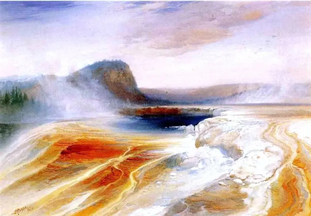 18" x 27" Thomas Moran The Castle Geyser Fire Hole Basin gallery wrap premium canvas print reproduced to meet museum quality standards. Our Museum quality canvas prints are produced using high-precision print technology for a more accurate reproduction printed on high quality canvas with fade-resistant, archival inks. Our progressive business model allows us to offer works of art to you at the best wholesale pricing, significantly less than art gallery prices, affordable to all. This artwork is hand stretched onto wooden stretcher bars by one of our expert framers. Our gallery wrap canvas print comes with hardware, ready to hang on your wall. We present a comprehensive collection of exceptional canvas art reproductions by Thomas Moran.