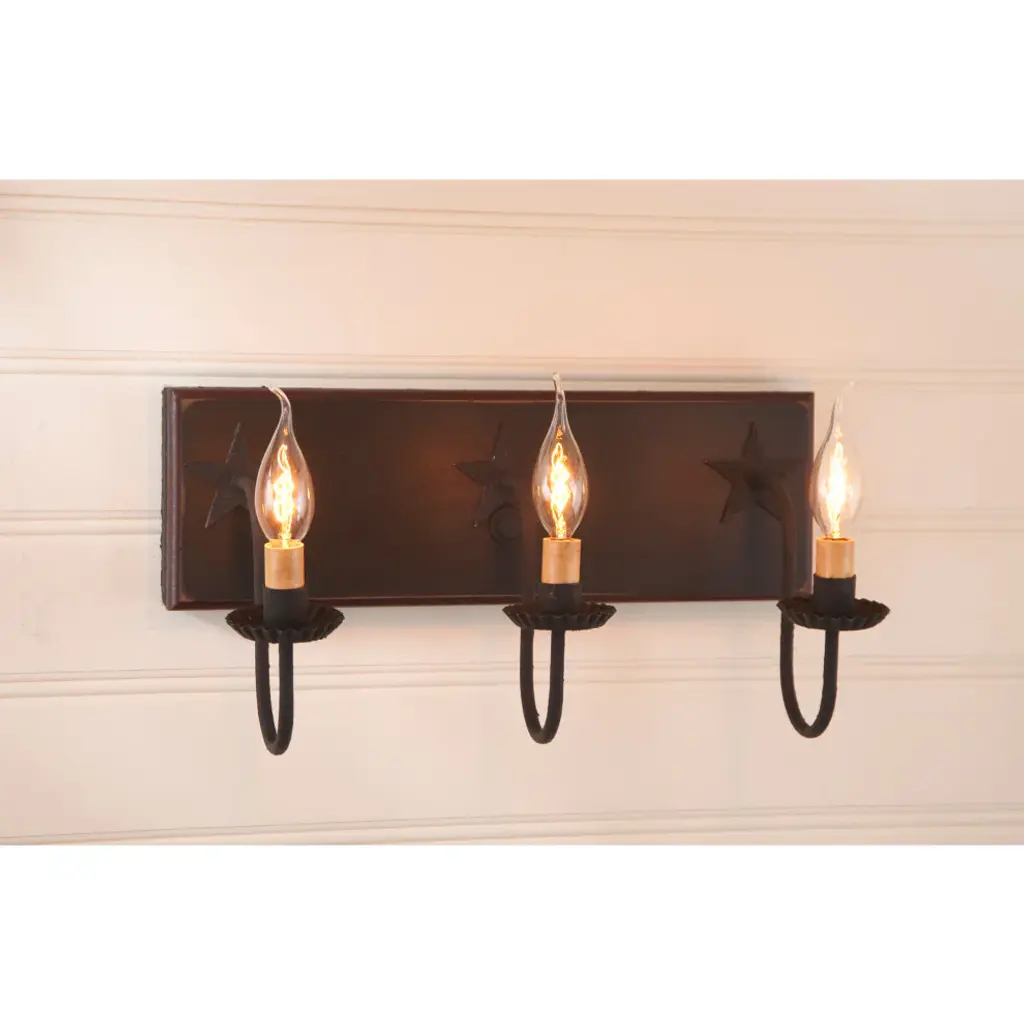 Measures 9-Inch high and 17.25-Inch wide and 8.5-Inch deepDirect hardwire; 3 candelabra sockets, 3 x 60 watts maximum wattageUL listed for dry locationsSmooth black with red stripe painted finish and textured arms with crimped pansSmooth black with red stripe painted finish and textured arms with crimped pansA classic country lighting fixture designed to illuminate your bathroom with the ease and charm of days gone by. With a handpainted and slightly distressed wooden back and metal star accents, this wonderful over the mirror light is sure to compliment your decor with any of our decorator colors.Direct wired with three E12/Candelabra sockets, 60 watts max. per arm. Sturbridge Black with red stripes body color. Black textured arms. Handcrafted in Pennsylvania. This mirror light is UL-CUL listed and has a 5 year guarantee.