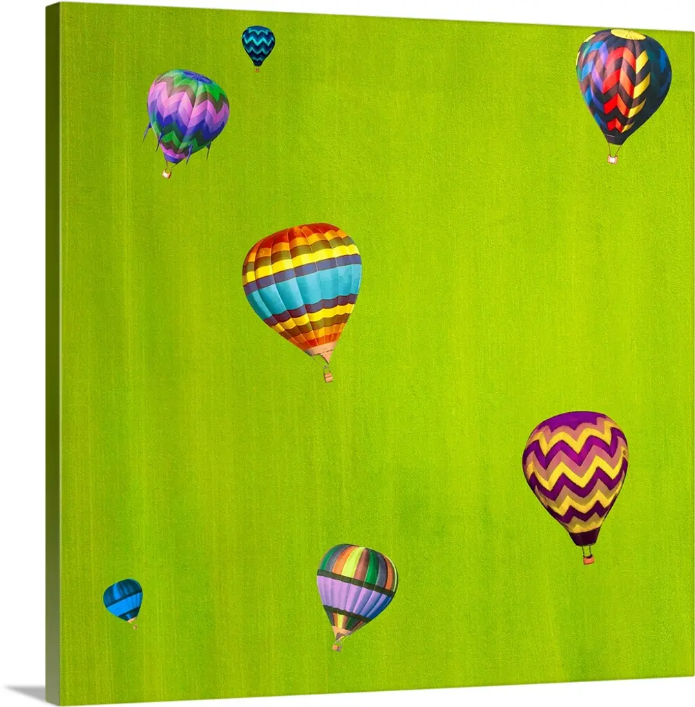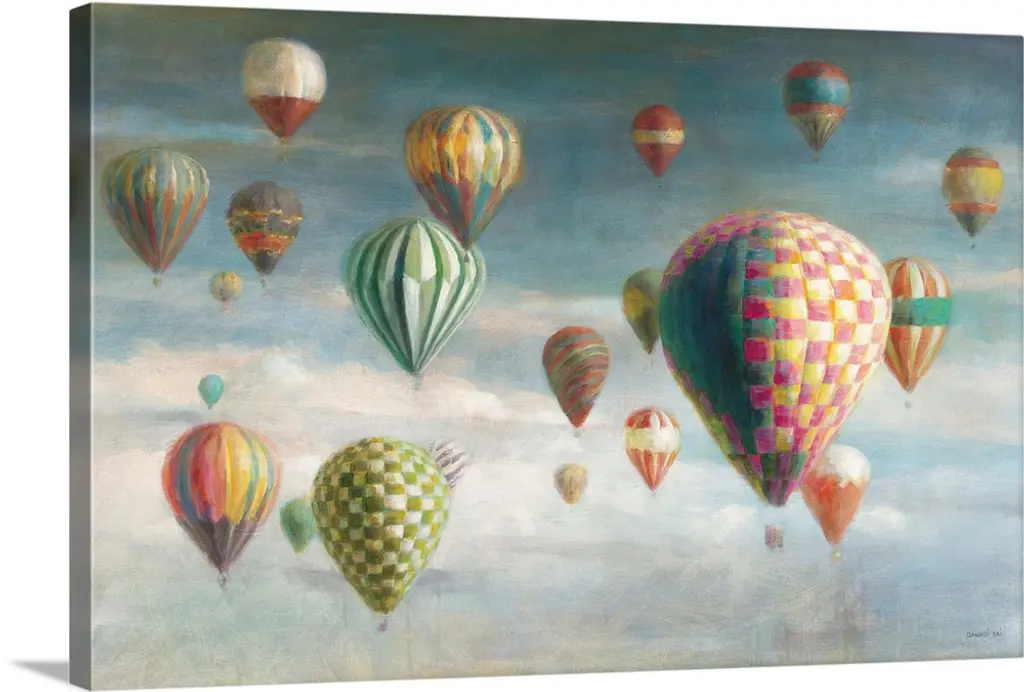 Contemporary painting of three hot air balloons over a rural San Diego landscape.