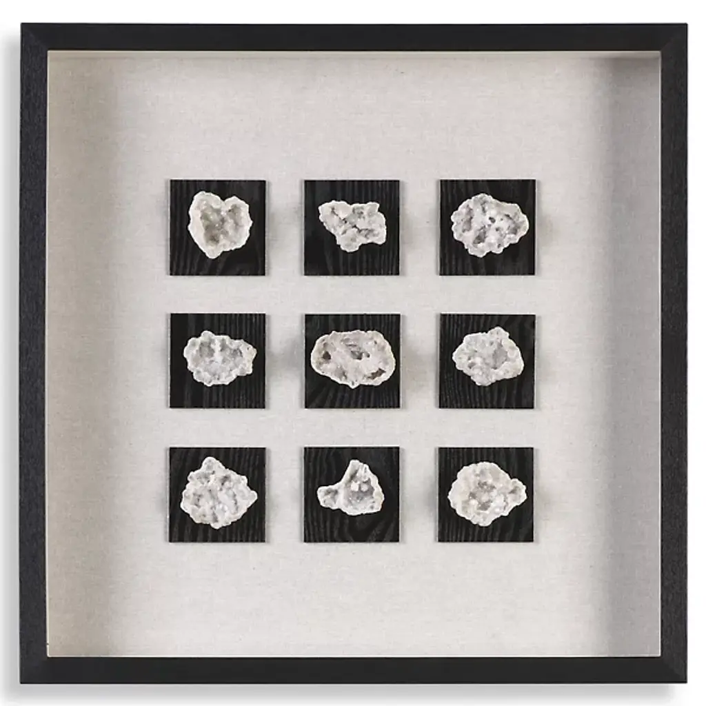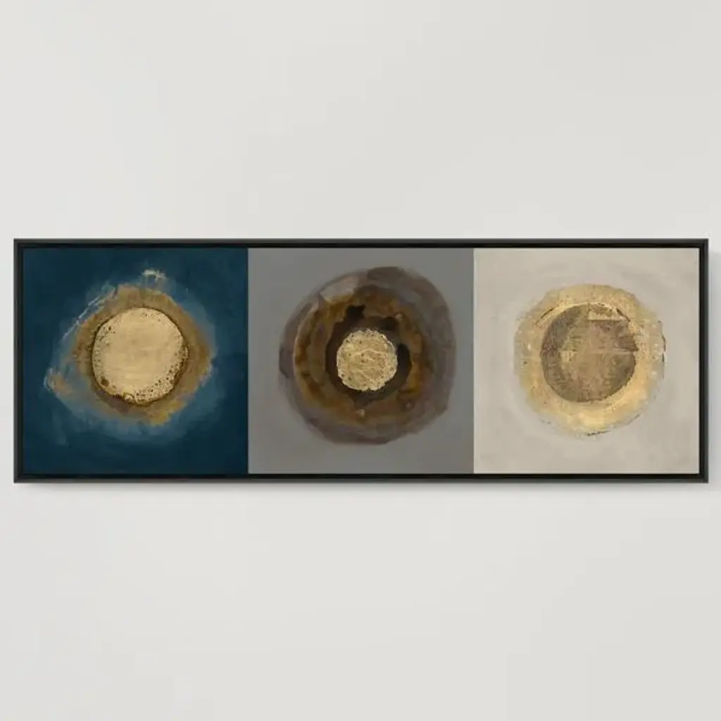 Wall art containing three blue geodes backed on linen background with distressed gold frame. Zentique combines unique designs with high-end materials to bring you the very best home decor in the business. When you order a product engineered and manufactured by Zentique, you''re guaranteed to get a product that is built to last for years and years to come. This product will come in ship-safe packaging materials and will be sure to impress!DimensionsLength: 35 in. Width: 2. 5 in. Height: 16 in. Some assembly required: No