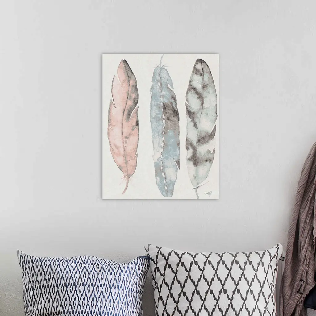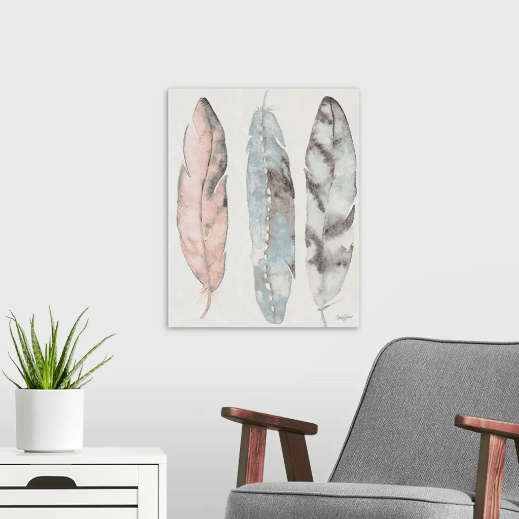 Watercolor painting of three feathers in muted shades of pink, blue, and grey.