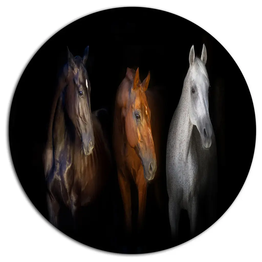 Bring Contemporary Abstraction to your home with this large Circle Metal wall art. This Three Horses with Golden Bridle Metal Artwork makes it the focal point of any room or office. - White Gloss Coating ensures colors are extra vibrant with light reflection.- Aluminum grade Sheet Metal with 1 inch mounting frame on the back giving the illusion that the artwork is floating on the wall..- Mounting Brackets are included along with instructions.- High Quality Digital images are created directly into a glossy aluminum panel producing a stunning and captivating print into the glossy finish of the metal.- Water, Fire and Scratch resistant HD Aluminum panels.- Looks better than any photo paper and guaranteed to last at least 20 years- Easy to clean with a microfiber cloth. Colors are far superior to regular Canvas Art. - Easy to Hang