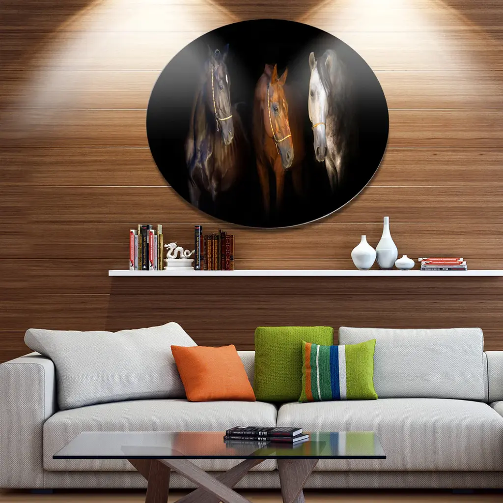 Three Horses With Golden Bridle, Animal Disc Metal Wall Art, 36"