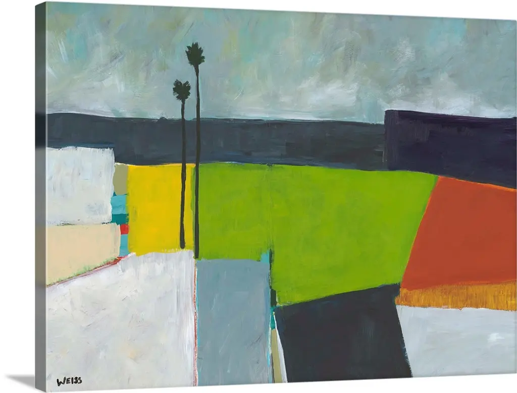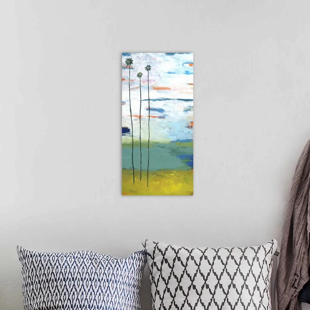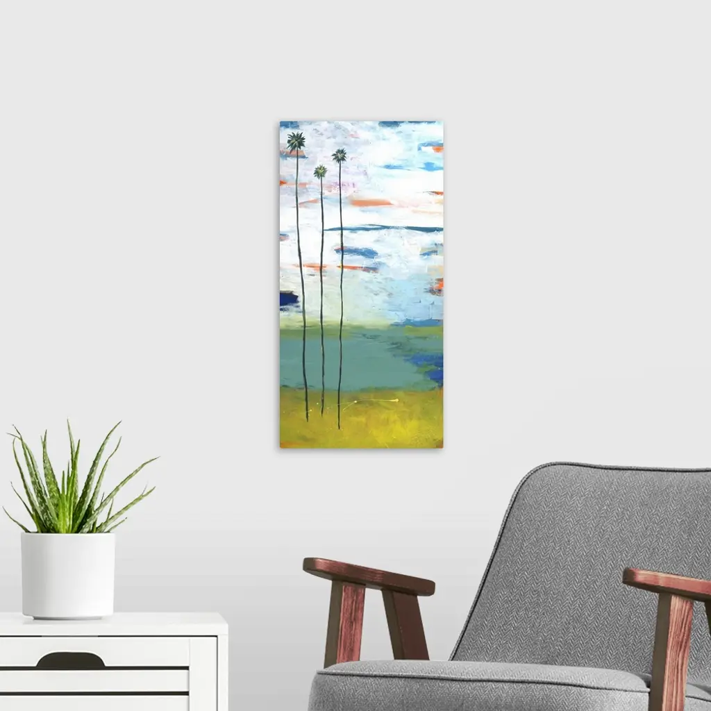 A contemporary abstract painting of three palm trees in a row with long and exaggerated tree trunks and a colorful background.