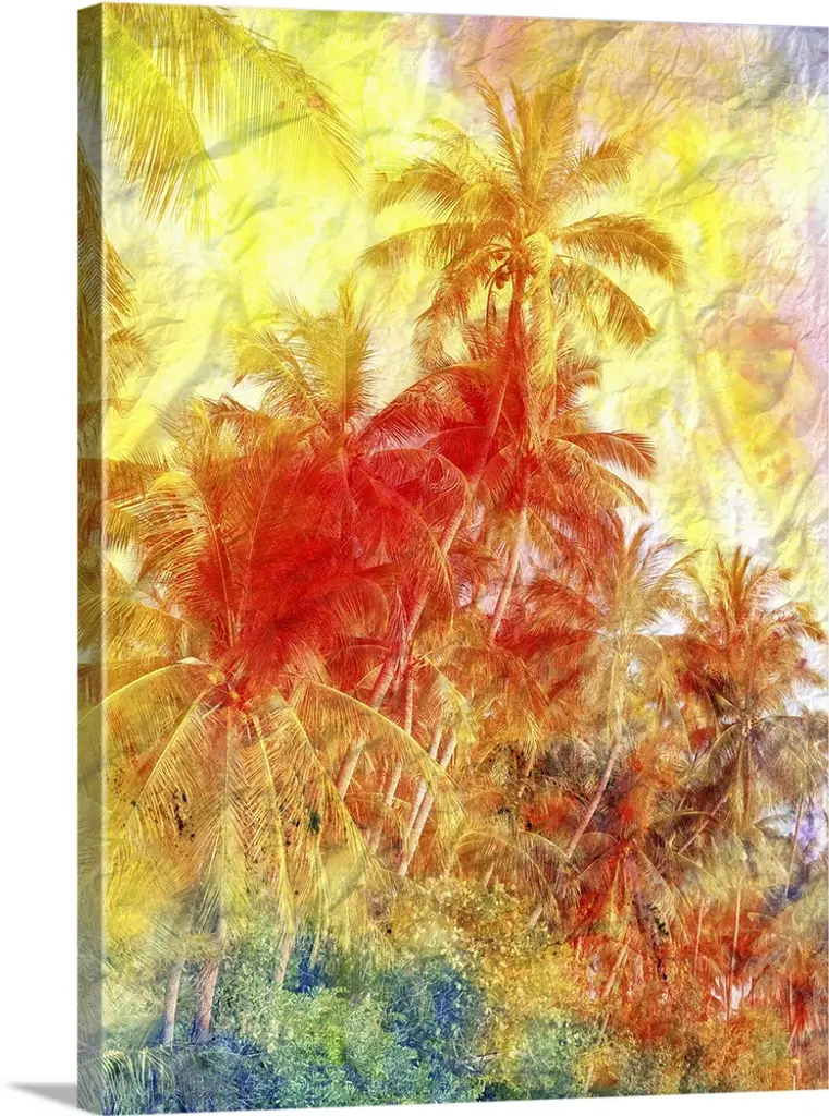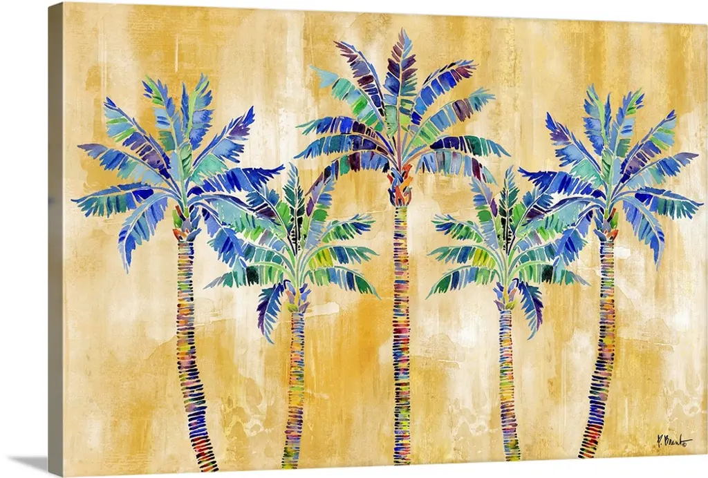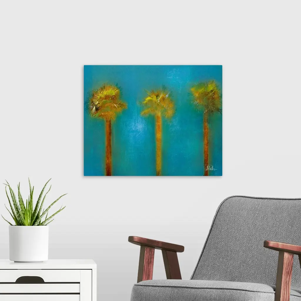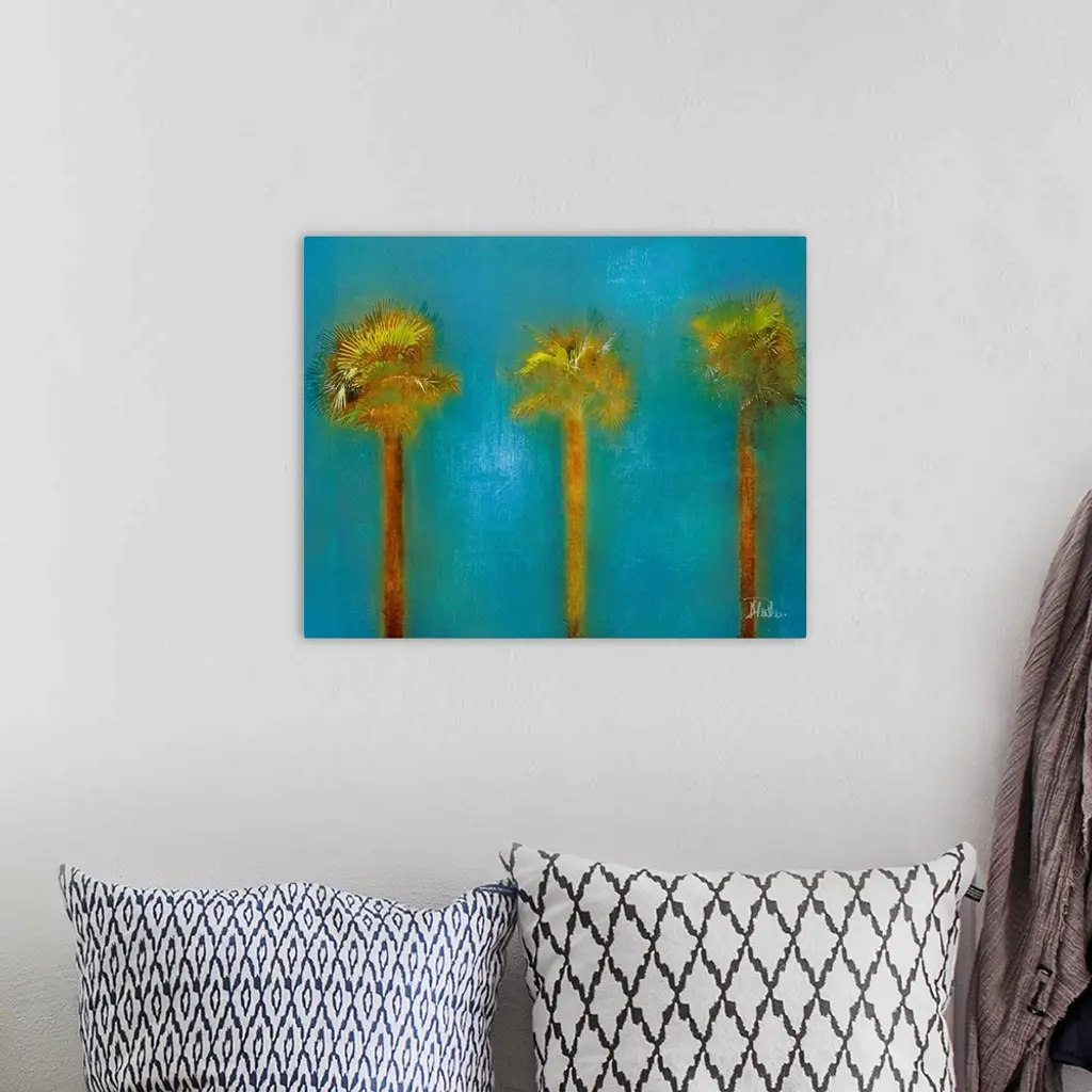 Contemporary artwork of three palm trees standing approximately the same distance from each other with a blue background.
