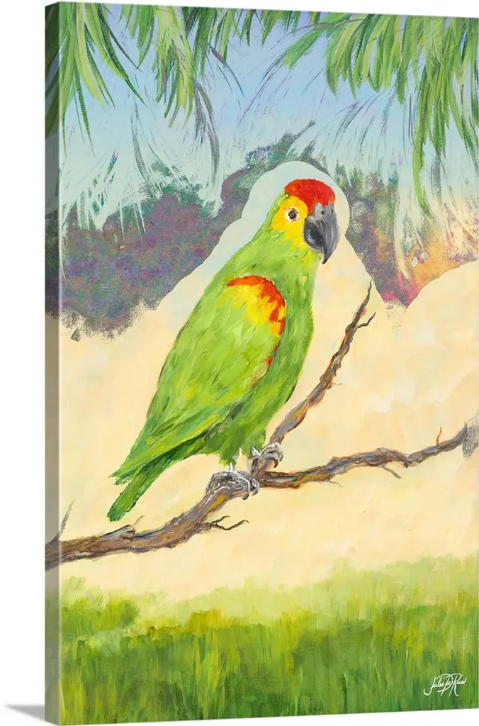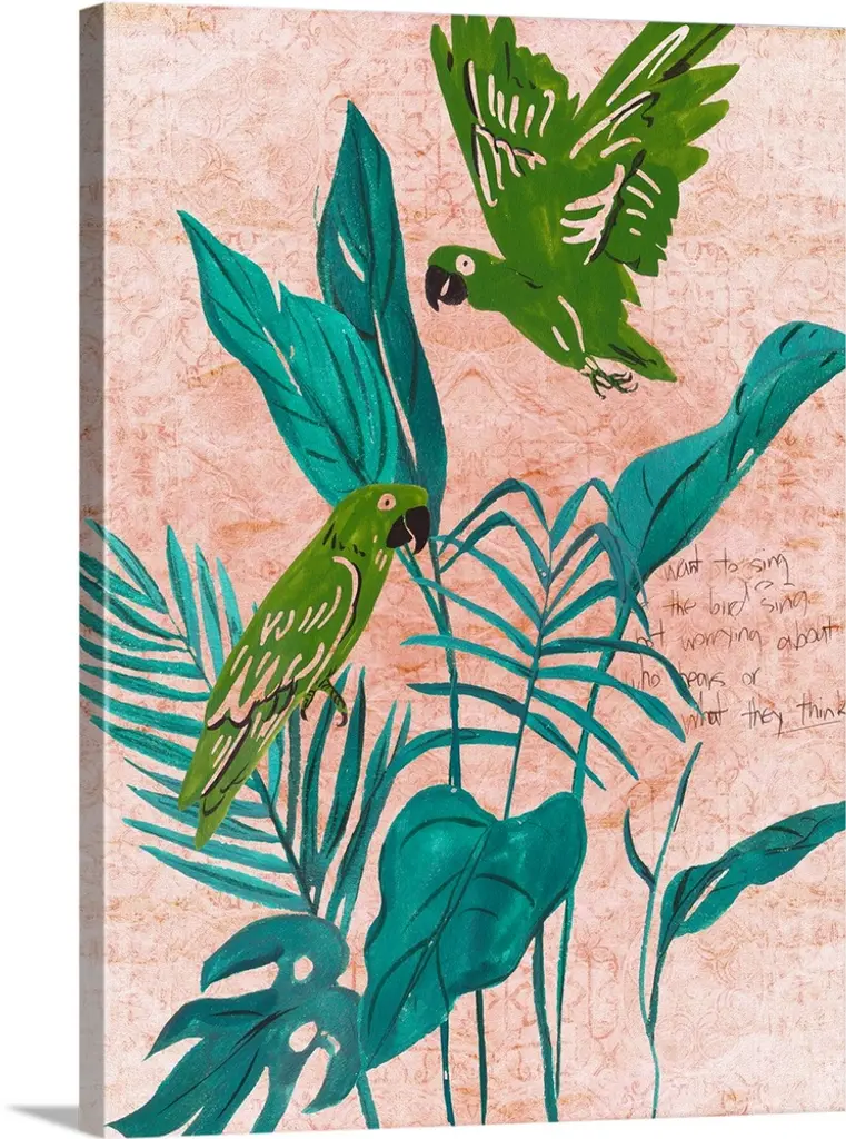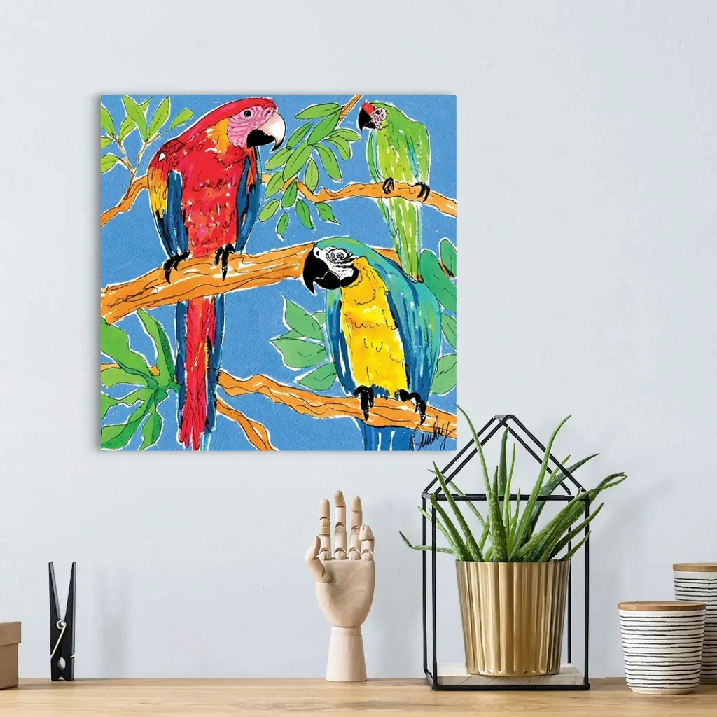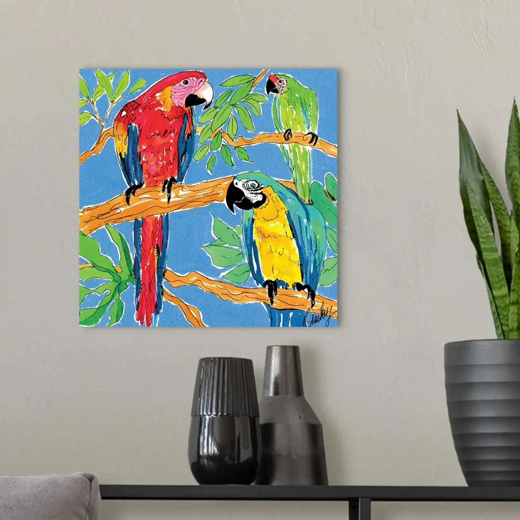 Contemporary artwork of three brightly colored macaw parrots, sitting on a branch together. Surrounded by lush tropical leaves.