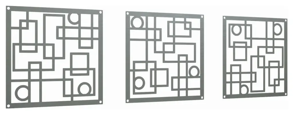 This geometric, 3-panel accent set creates visual separation and adds depth to any room. Each panel is composed of round and oblong shapes that overlap to create a uniquely intricate texture. Crafted in India out of stainless steel, these panels make a bold statement anywhere.Features:• Laser Cut• Stainless Steel• Hardware includedDimensions:Wall Panel• Assembled Product: 12 inches wide x 0.08 inches deep x 12 inches high• Weight Capacity: 550 poundsAdditional Dimensions• • Welcome to the home of quality, uniquely designed furniture! We have pieces to spice up your indoor living space, and offer sustainable outdoor furniture too. Each piece is eco-friendly, handcrafted, and one-of-a-kind. Unlike the same old pieces that all your friends have, Strata Furniture is guaranteed to turn your house into a unique, welcoming home. Strata is Simply The Best!