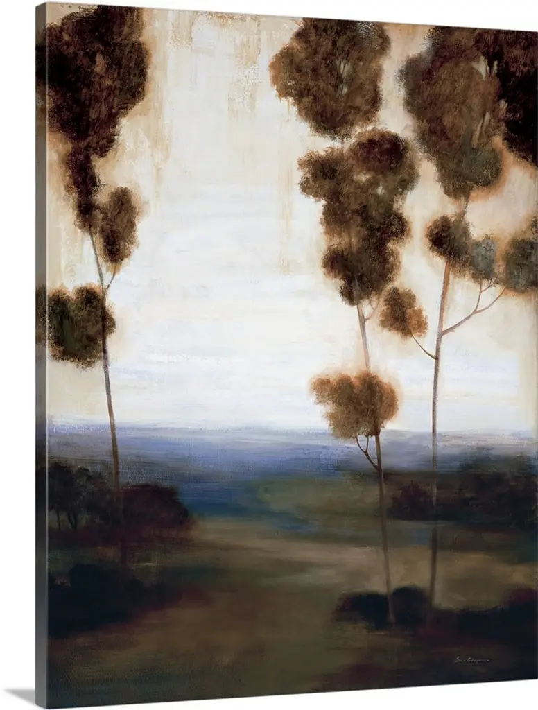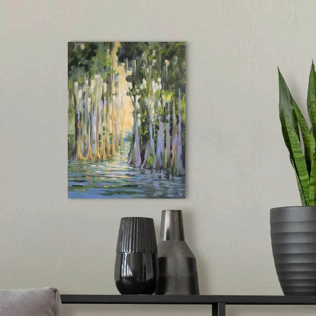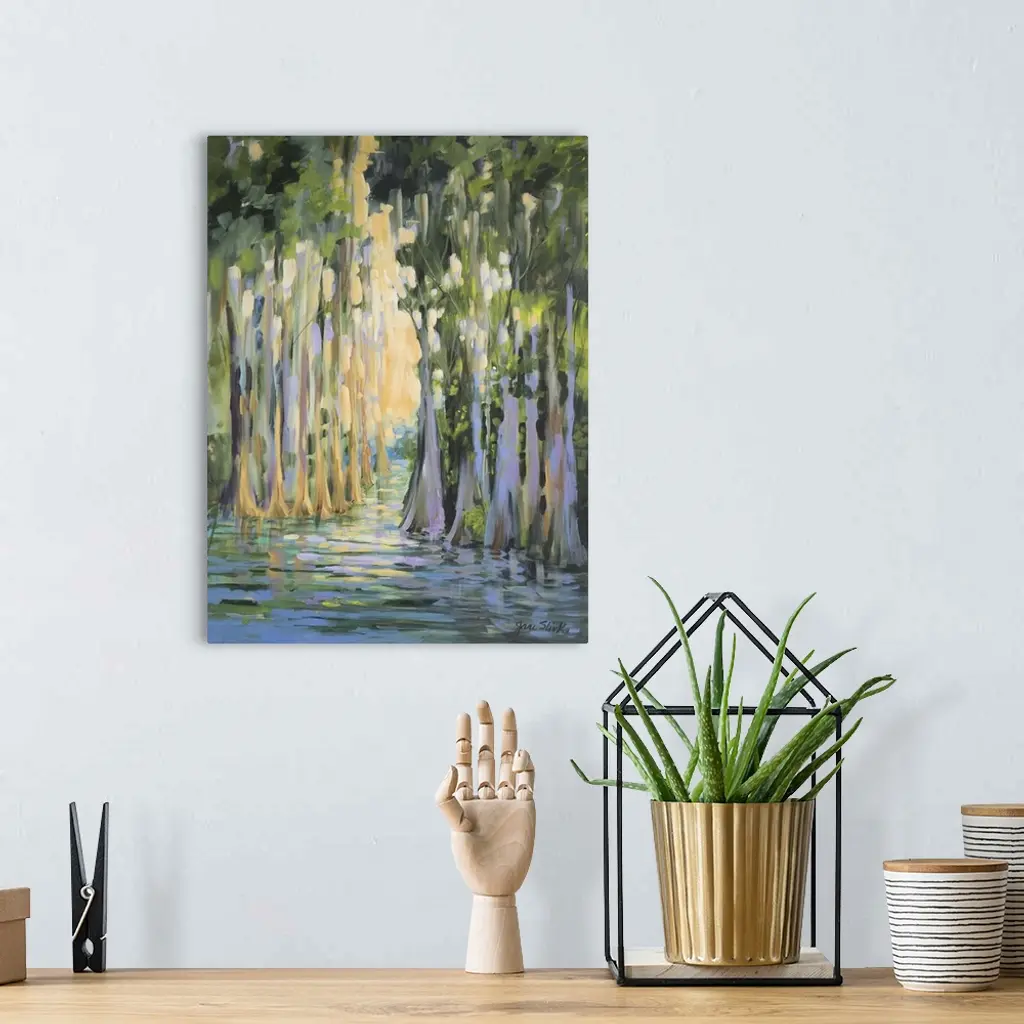 Contemporary artwork of a swampy forest with golden sunlight.
