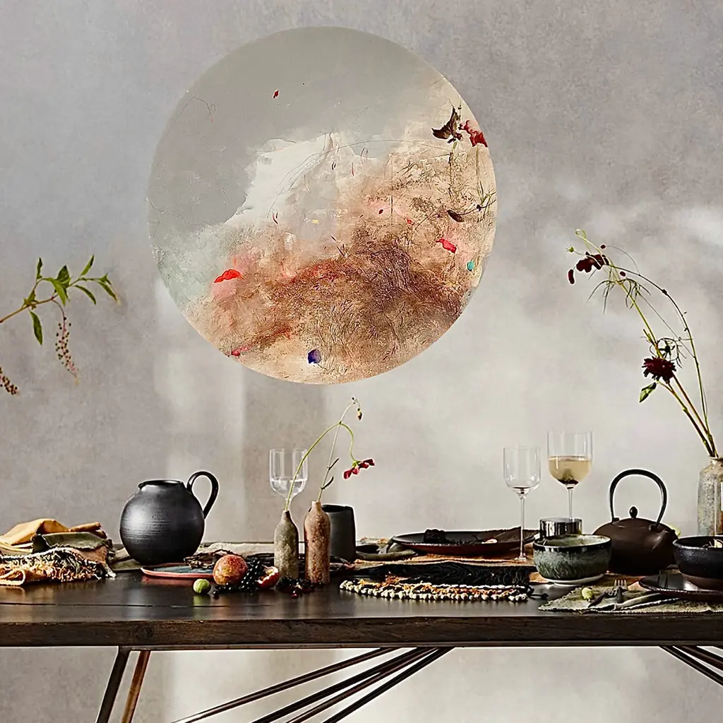 The intricate, abstract design in Through the moon VII is a stunning display of visual impact that features muted grey tones harmonizing with various shades of brown and hints of black, purple, pink and green. This breathtaking work of art by Beata Pankiewicz is a study in duality that shifts between manmade and natural worlds as raw texture contrasts with intricate whimsy and organic imperfections. The complexity and abstract nature of her art allows for layers of surprise and discovery that reflect her own creative process.