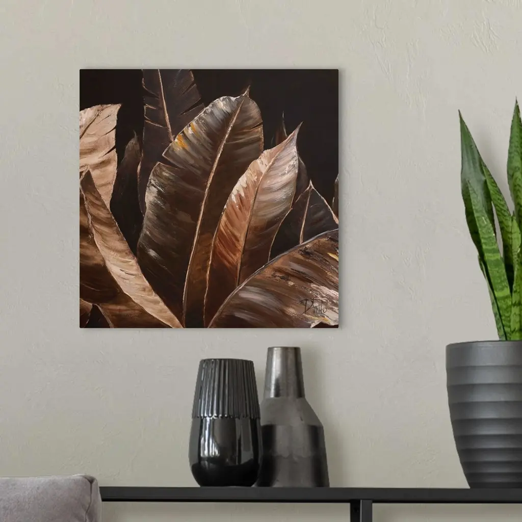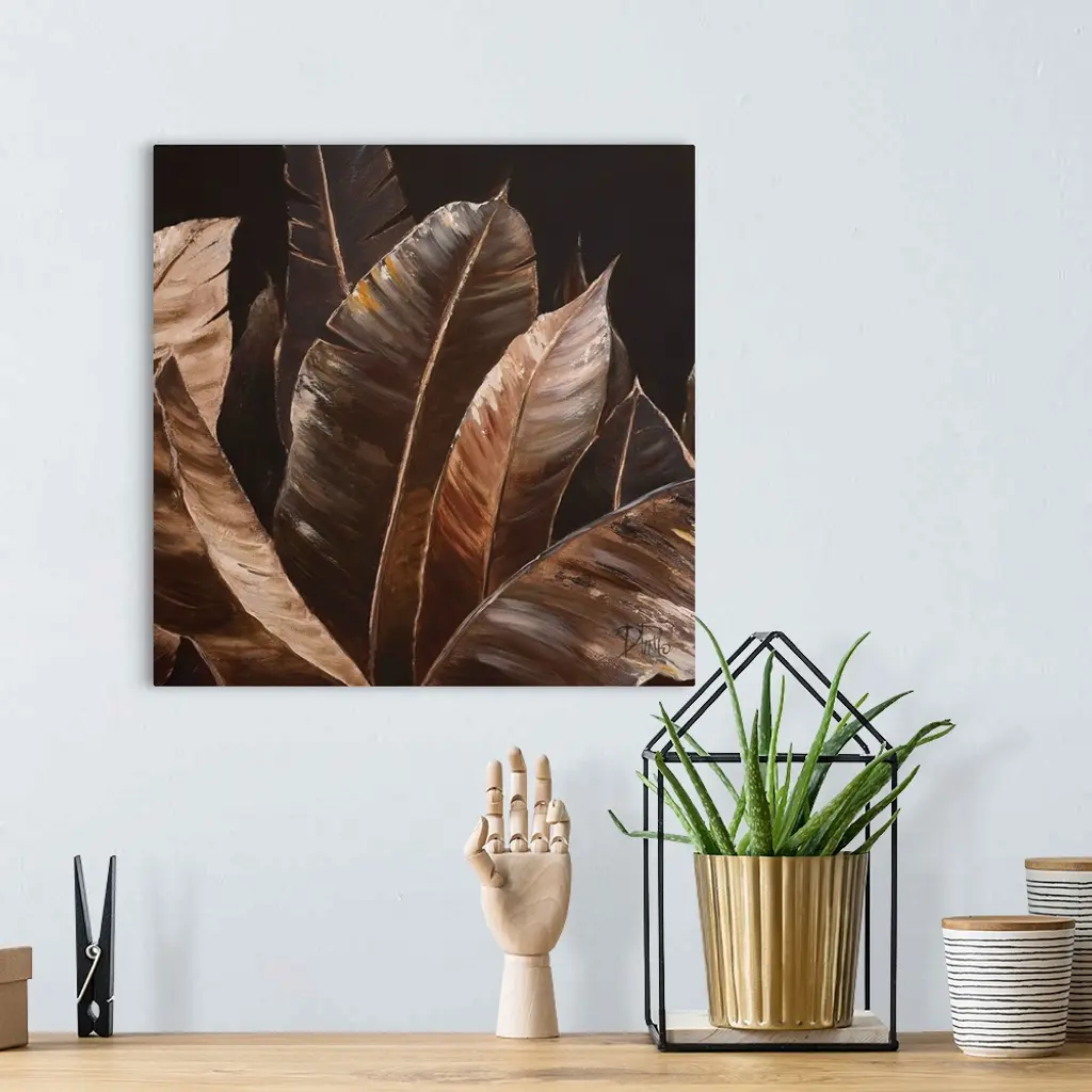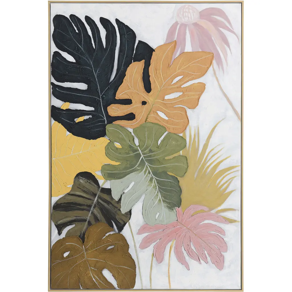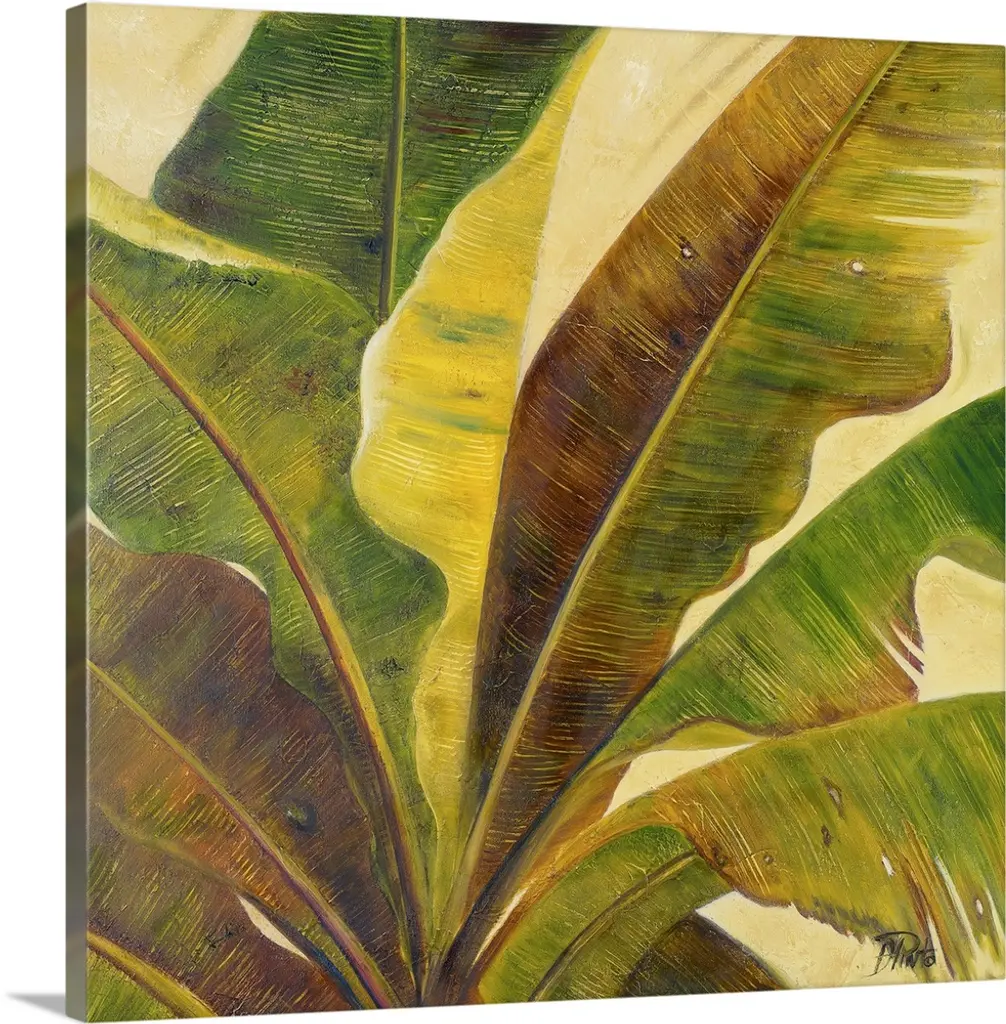 Contemporary painting of big lush tropical leaves.
