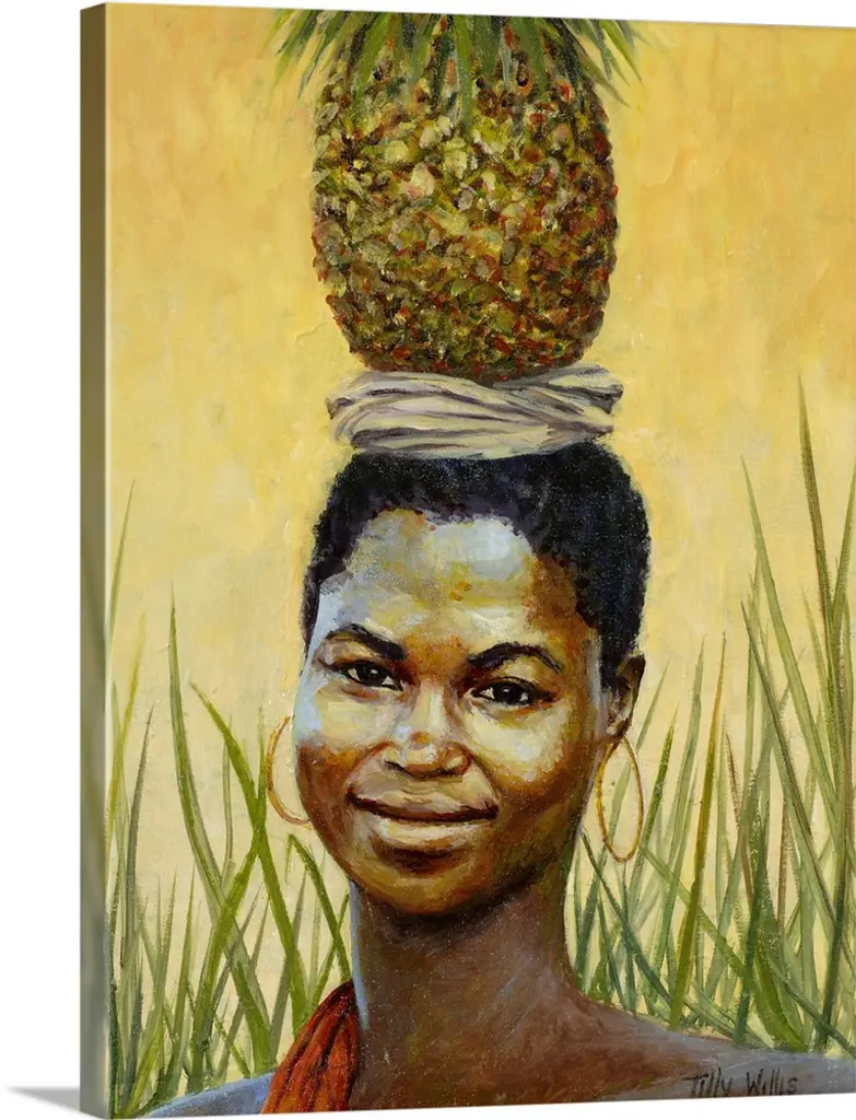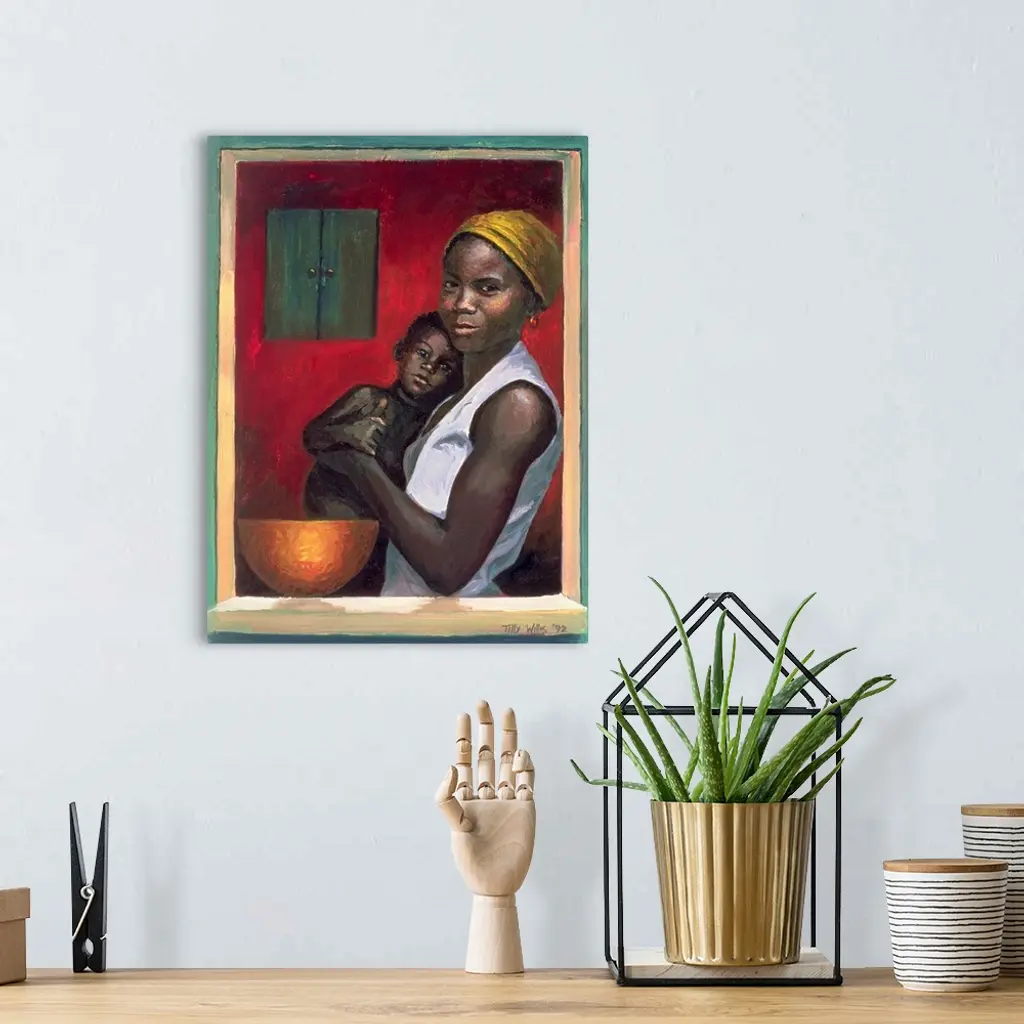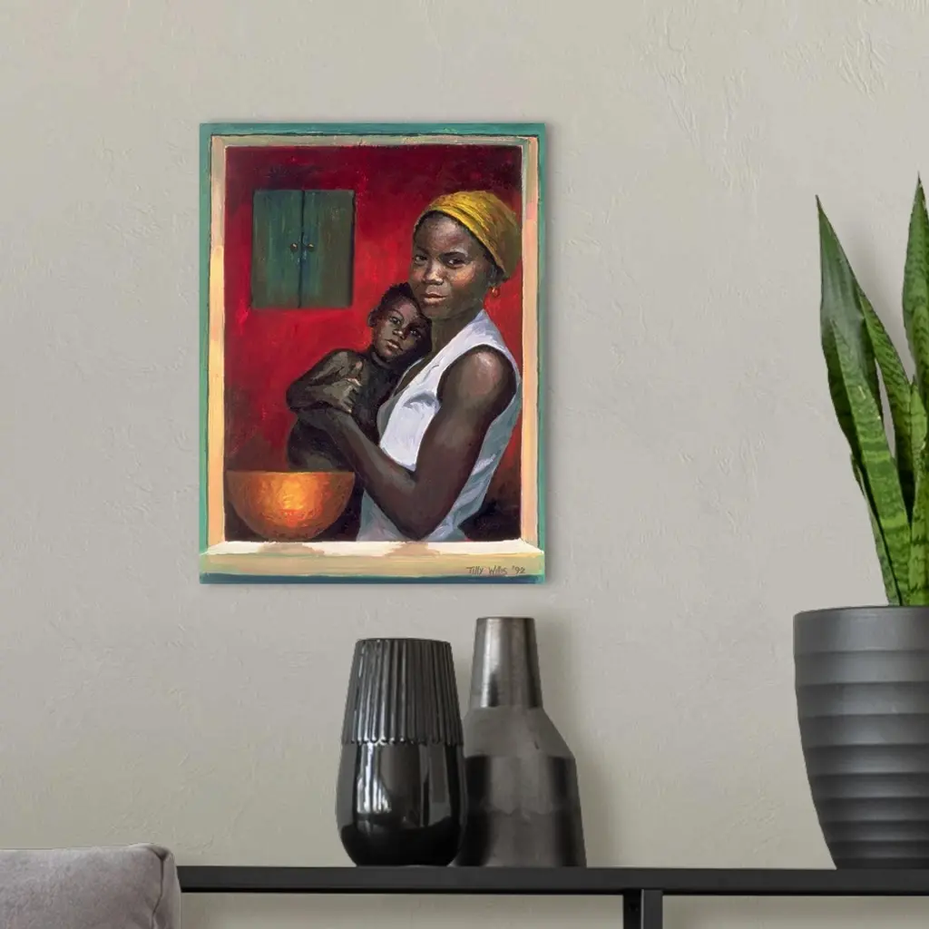 Contemporary painting of a dark-skinned woman holding her young son with a bowl and a cupboard, seen through an open window.