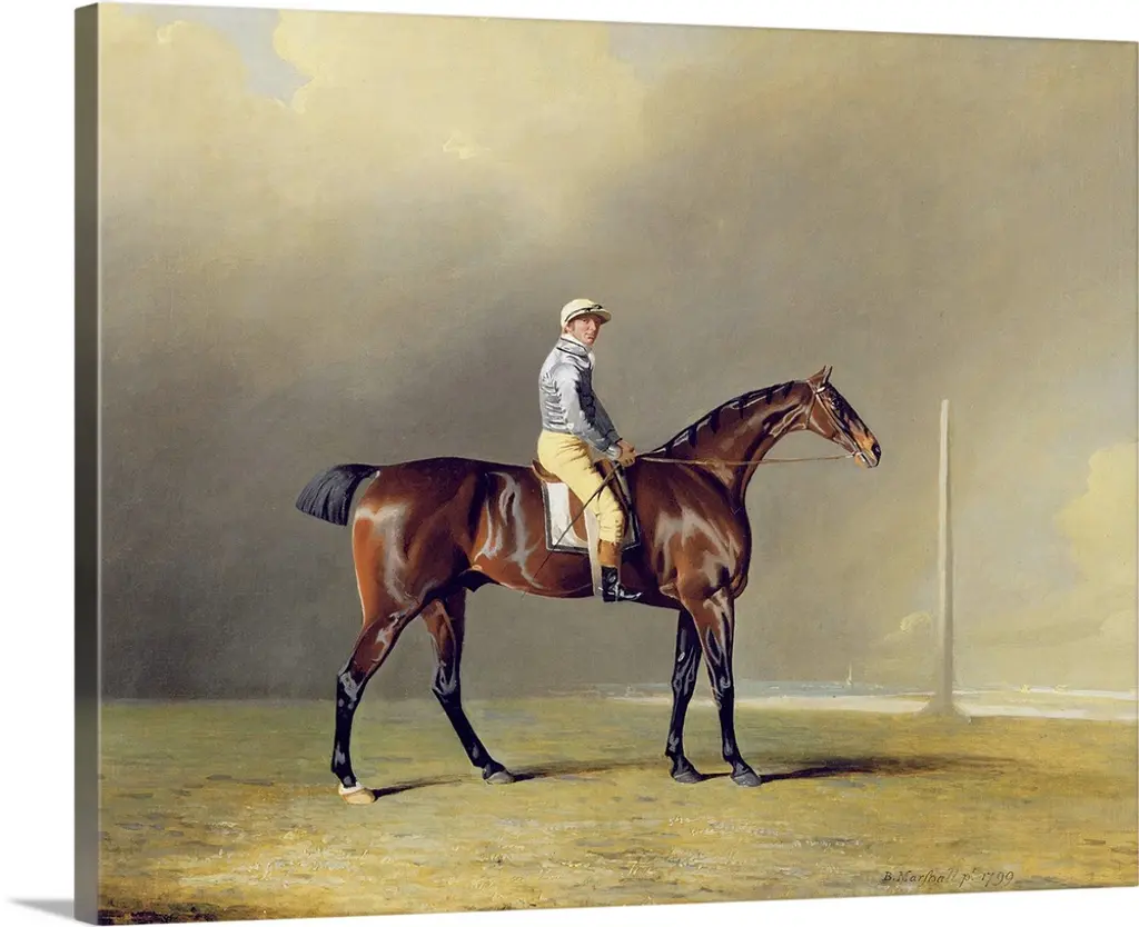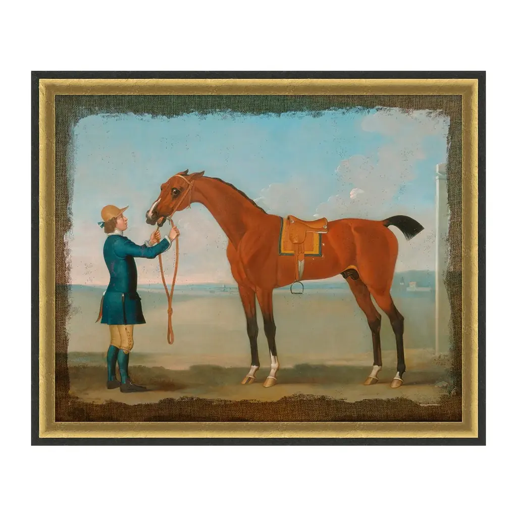 Large antique poster of a man holding the reins of two horses on either side of him while they graze.