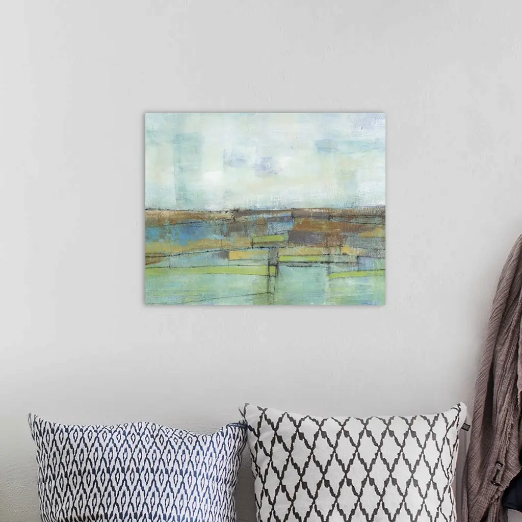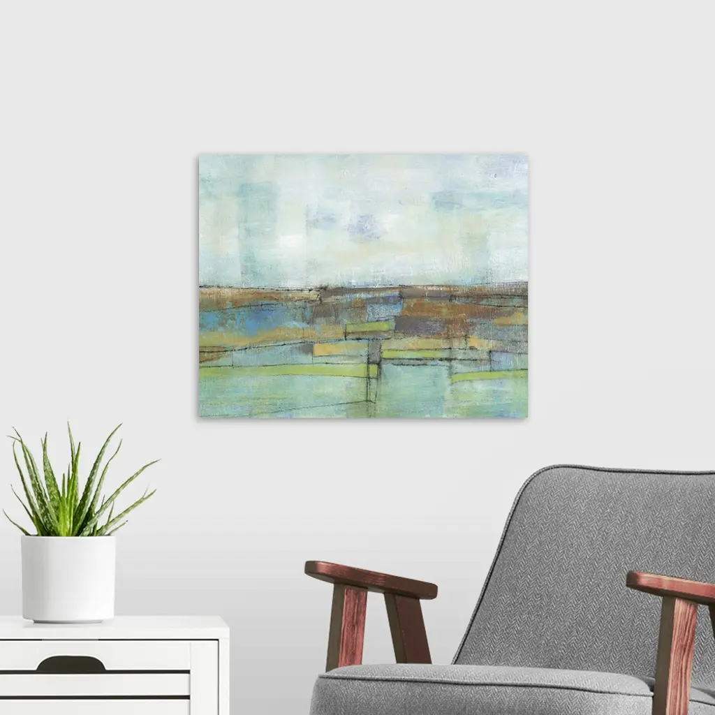 Contemporary abstract painting using green and blue tones to create what looks like a field.