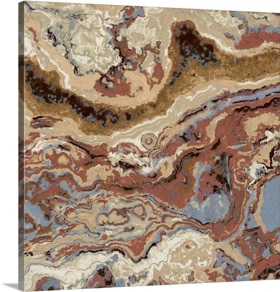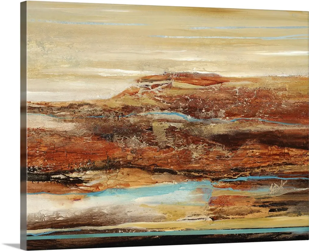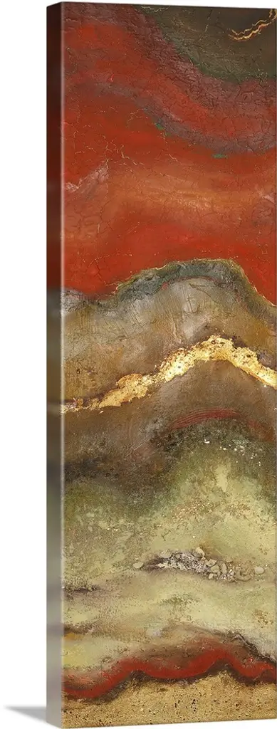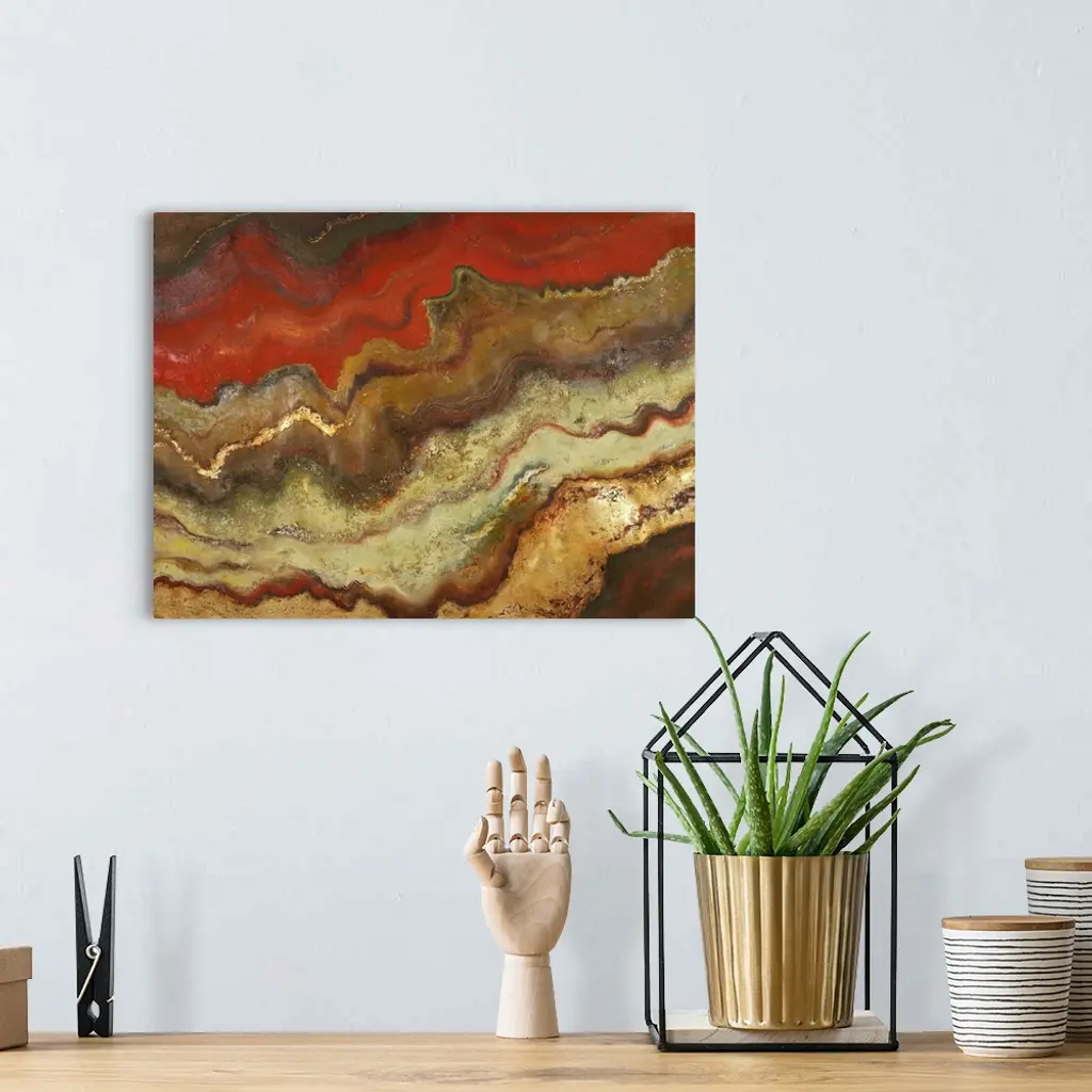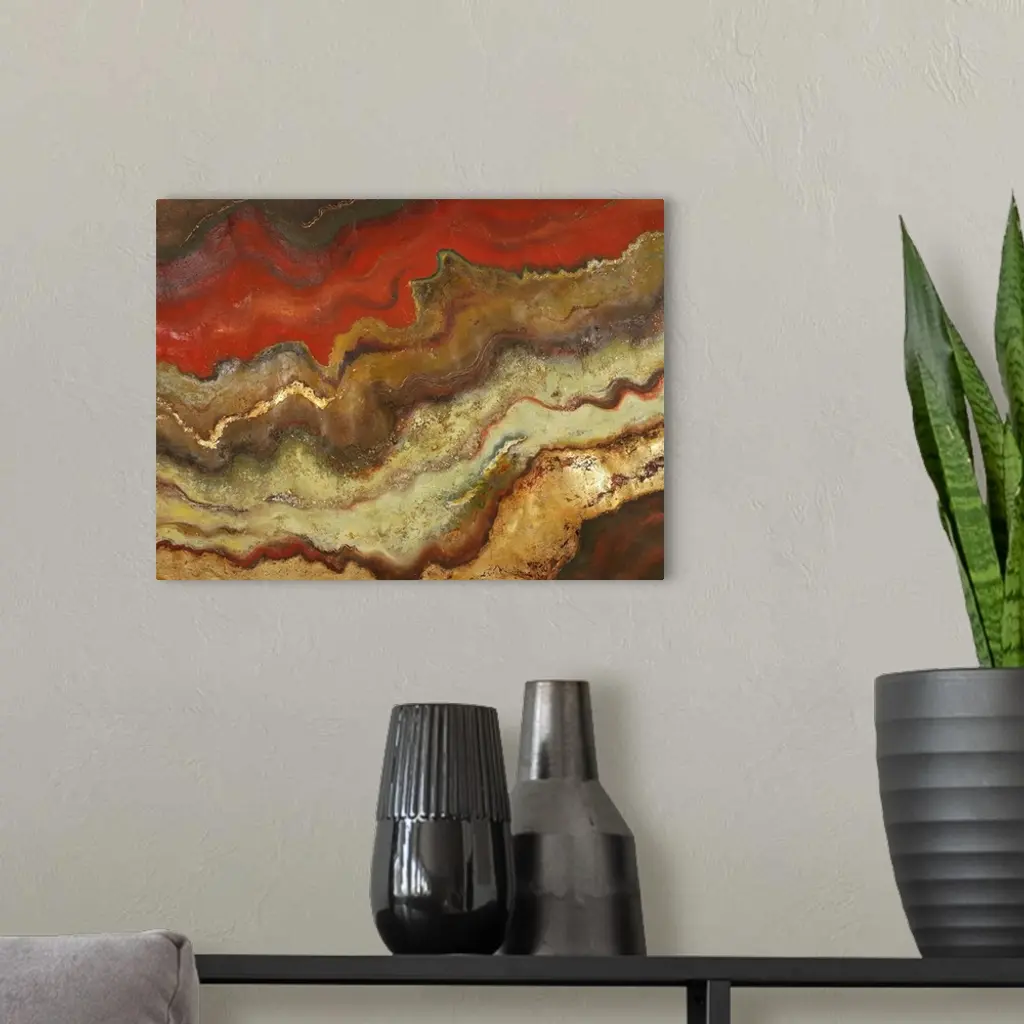 Mixed media contemporary artwork of abstract waves of rusty, rocky colors, resembling sedimentary layers and natural minerals.