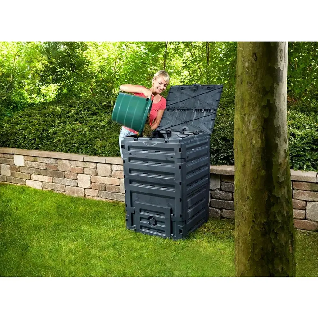 The Eco Master composter transforms kitchen scraps into nutrient-rich compost. It's made from 100% recycled, UV-resistant polypropylene, making it environmentally friendly. Notable features include a single-piece feed opening, a lid with wind protection, and a large flap with a handle for easy compost removal. It offers optimal ventilation and requires minimal space. The composter is simple to assemble without any tools and is manufactured in Germany. Dimensions: 25.6"L x 23.6"W x 35.5"H, 79 gallons.