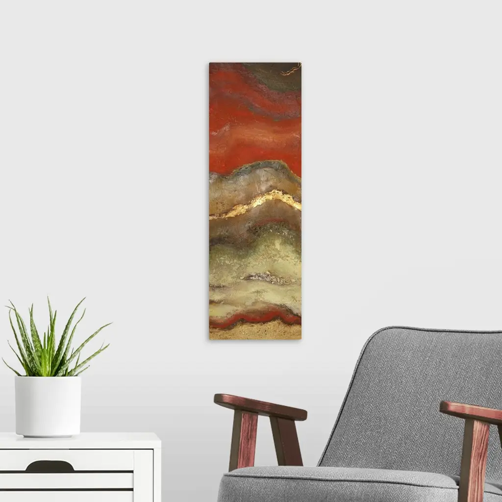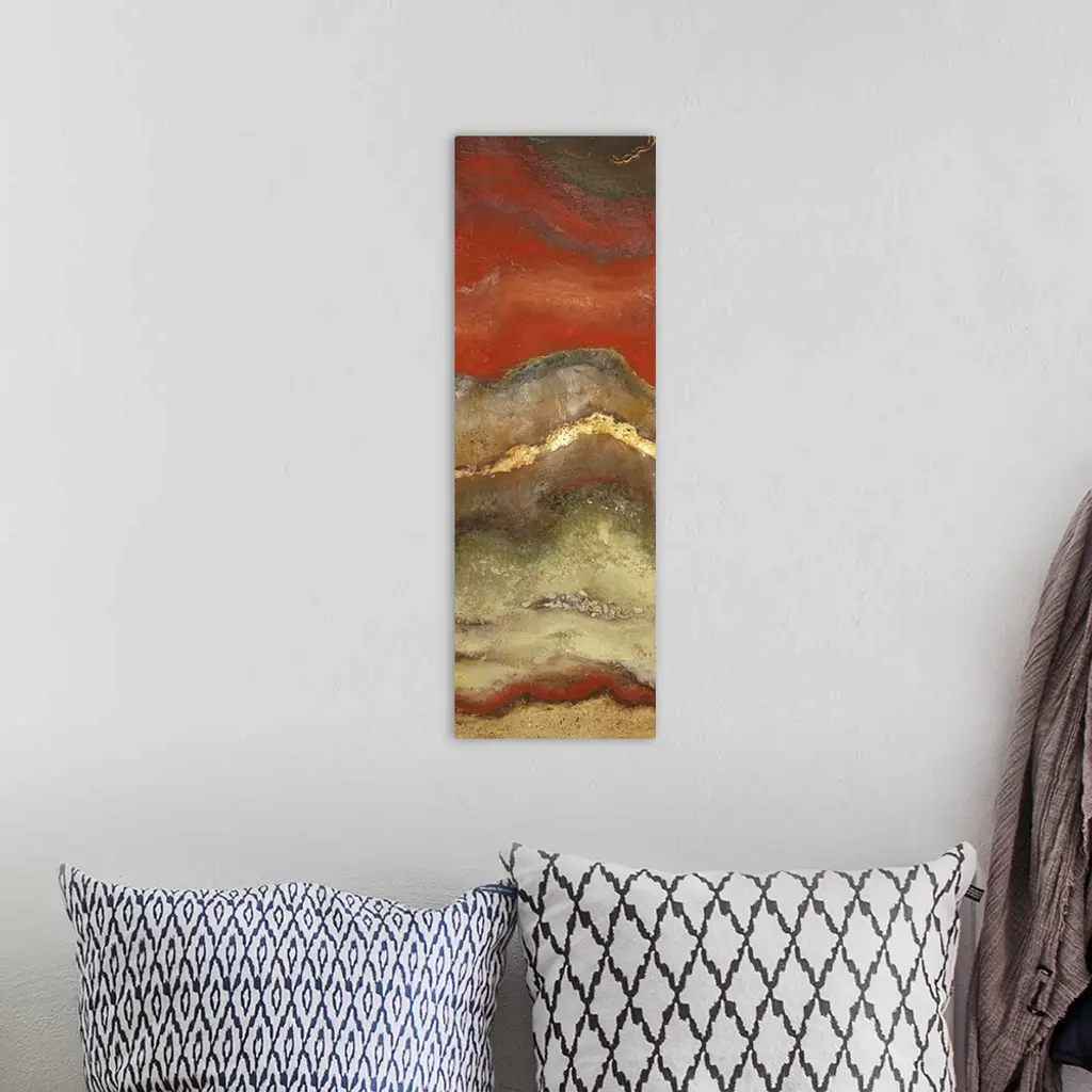 This piece of abstract artwork has a rust like pattern with red mostly shown on top of the thin vertical print and neutral colors toward the bottom.
