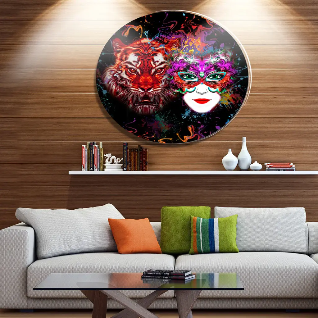 Tiger And Woman Colorful Faces, Abstract Large Disc Metal Wall Art, 36"