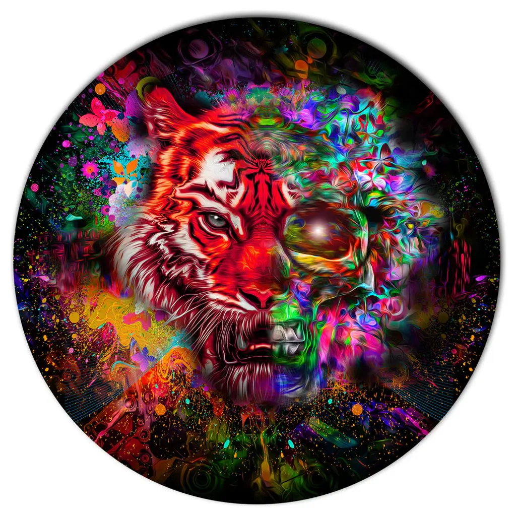 Bring Contemporary Abstraction to your home with this large Circle Metal wall art. This Tiger and Woman Colorful Faces Metal Artwork makes it the focal point of any room or office. - White Gloss Coating ensures colors are extra vibrant with light reflection.- Aluminum grade Sheet Metal with 1 inch mounting frame on the back giving the illusion that the artwork is floating on the wall..- Mounting Brackets are included along with instructions.- High Quality Digital images are created directly into a glossy aluminum panel producing a stunning and captivating print into the glossy finish of the metal.- Water, Fire and Scratch resistant HD Aluminum panels.- Looks better than any photo paper and guaranteed to last at least 20 years- Easy to clean with a microfiber cloth. Colors are far superior to regular Canvas Art. - Easy to Hang