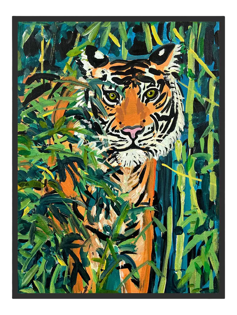 DESCRIPTION: Tiger in Bamboo by Jelly Chen in White Framed Paper, Medium Art Print SPECIFICATIONS: Type: Framed Paper. Framed Size (in): 27x36. Orientation: Vertical. Flush/Float/Matted: Flush. Frame Color: White. Hanging Hardware: Picture Perfect. FRAMING: Each art work arrives framed and ready to hang. We use handmade frames with a plexiglass glazing front, because it offers less glare than standard glass. At this time, we only offer framed prints. ARTIST BIO: Jelly Chen is a Brooklyn, New York based visual artist creating paintings and collages. Originally from Austin, Texas, she studied sculpture at Texas State University. She travelled and lived abroad for 6 years teaching ESL in Hong Kong, Istanbul, Bali, and Shanghai. In addition to visiting over 30 countries, she met her husband whom she lived with in Shanghai before relocating to Brooklyn. Since becoming a New Yorker, she has focused on making paintings and raising a family. Her ebullient ‘Fresh Art’ is characterized by animals with personality, patterns, plants, and a carefree nature.
