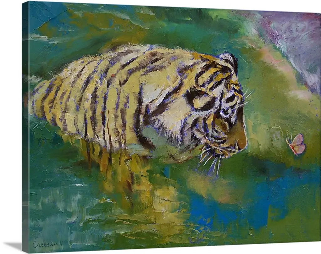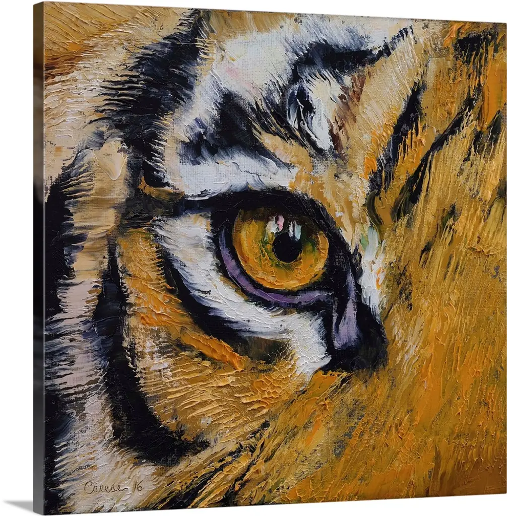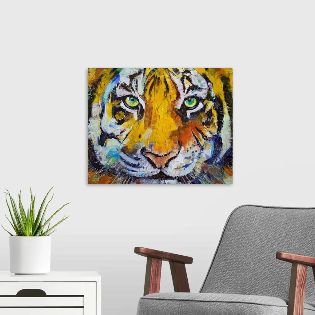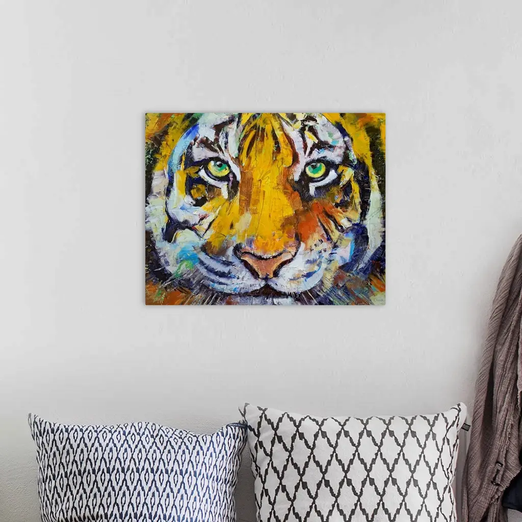 Painting of a close up of a tigers face with his green eyes staring directly at you.