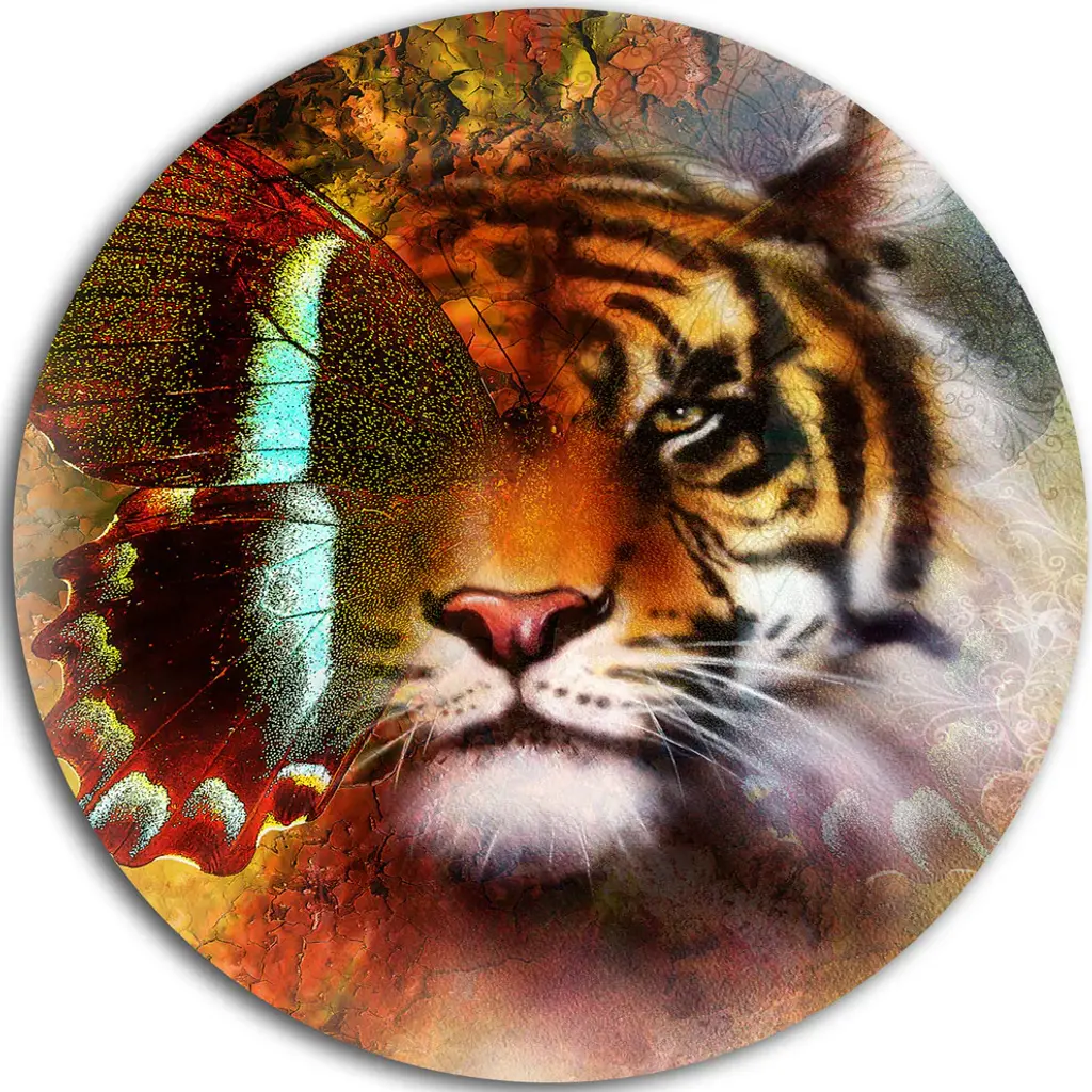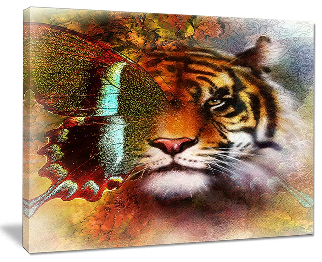 Bring contemporary abstraction to your home with this large 36W x 28H Metal Wall Art. This Tiger with Butterfly Wings Metal Artwork makes it the focal point of any room or office. - White gloss coating ensures colors are extra vibrant with light reflection.- Aluminum grade sheet metal with 1-inch mounting frame on the back giving the illusion that the artwork is floating on the wall.- Mounting brackets are included along with instructions.- High quality digital images are created directly into a glossy aluminum panel producing a stunning and captivating print into the glossy finish of the metal.- Water, fire and scratch resistant HD aluminum panels.- Looks better than any photo paper and guaranteed to last at least 20 years- Easy to clean with a microfiber cloth. Colors are far superior to regular canvas art. - Easy to hang