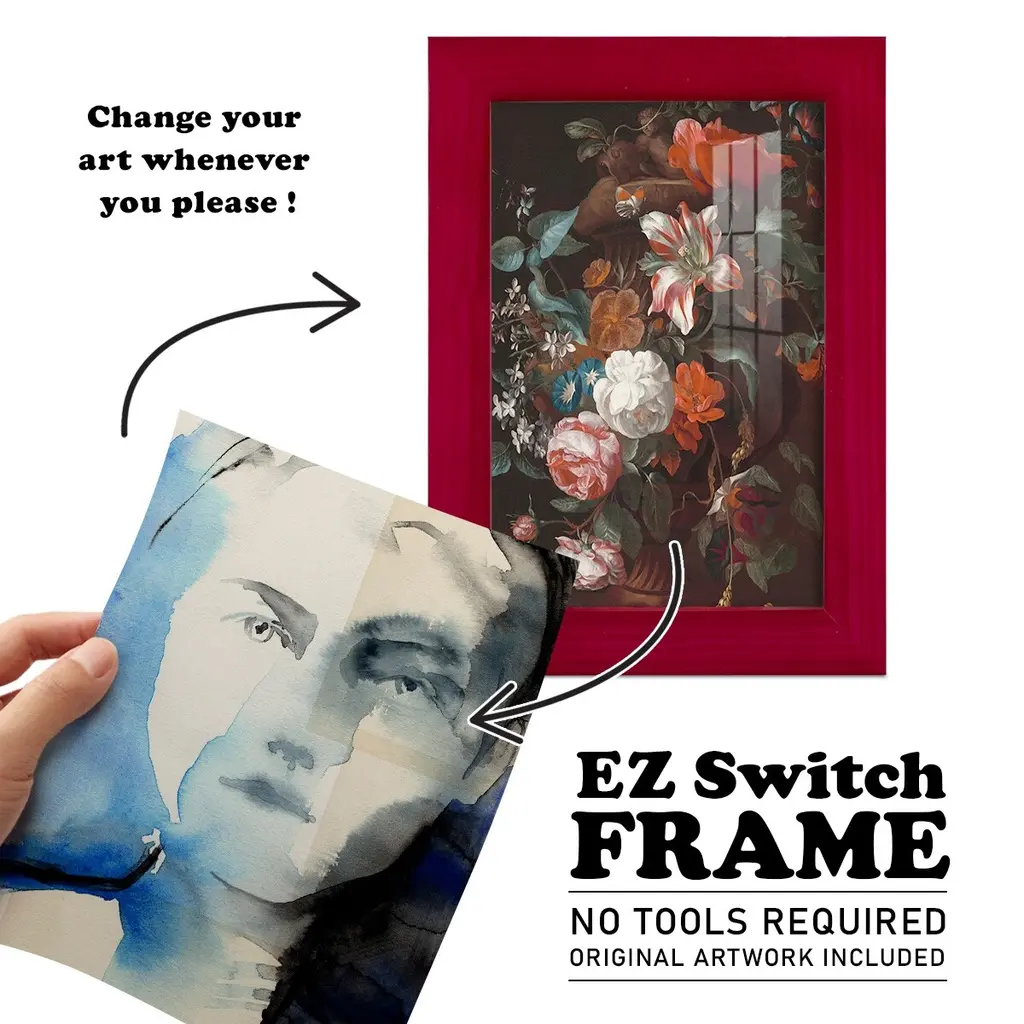 Tilda's Gaze I -EZ SWITCH Framed Print w/glass-Cherry Red A delightful, framed print. Featuring a solid wood frame with real wood glass. This premium print is giclee quality. In addition, every frame features a removable back and table top stand. This allows you to change your art in the future or to just stand the art on a table for a new look. We are sure you'll enjoy our new series of EZ SWITCH Framed Art. Solid Wood Frame Real Glass Removable / Replaceable Art Built in Tabletop Stand Sizes range from 4x6 up to 12x15 - buy just one or pair them up as sets as you see fit.