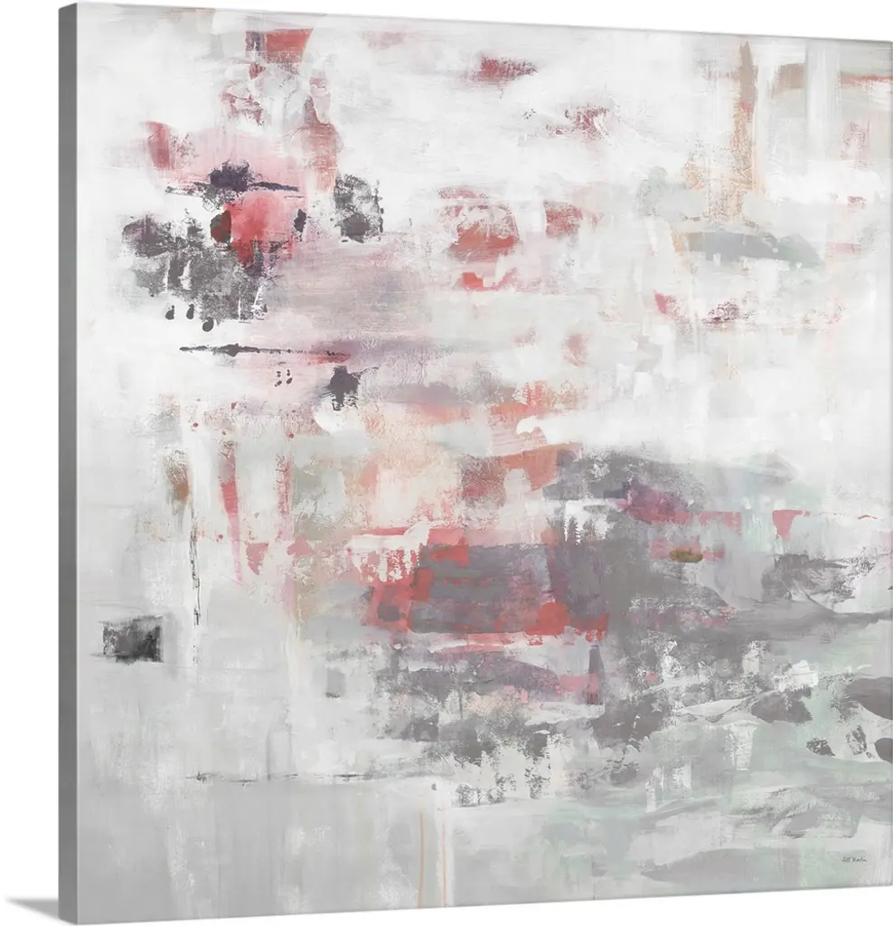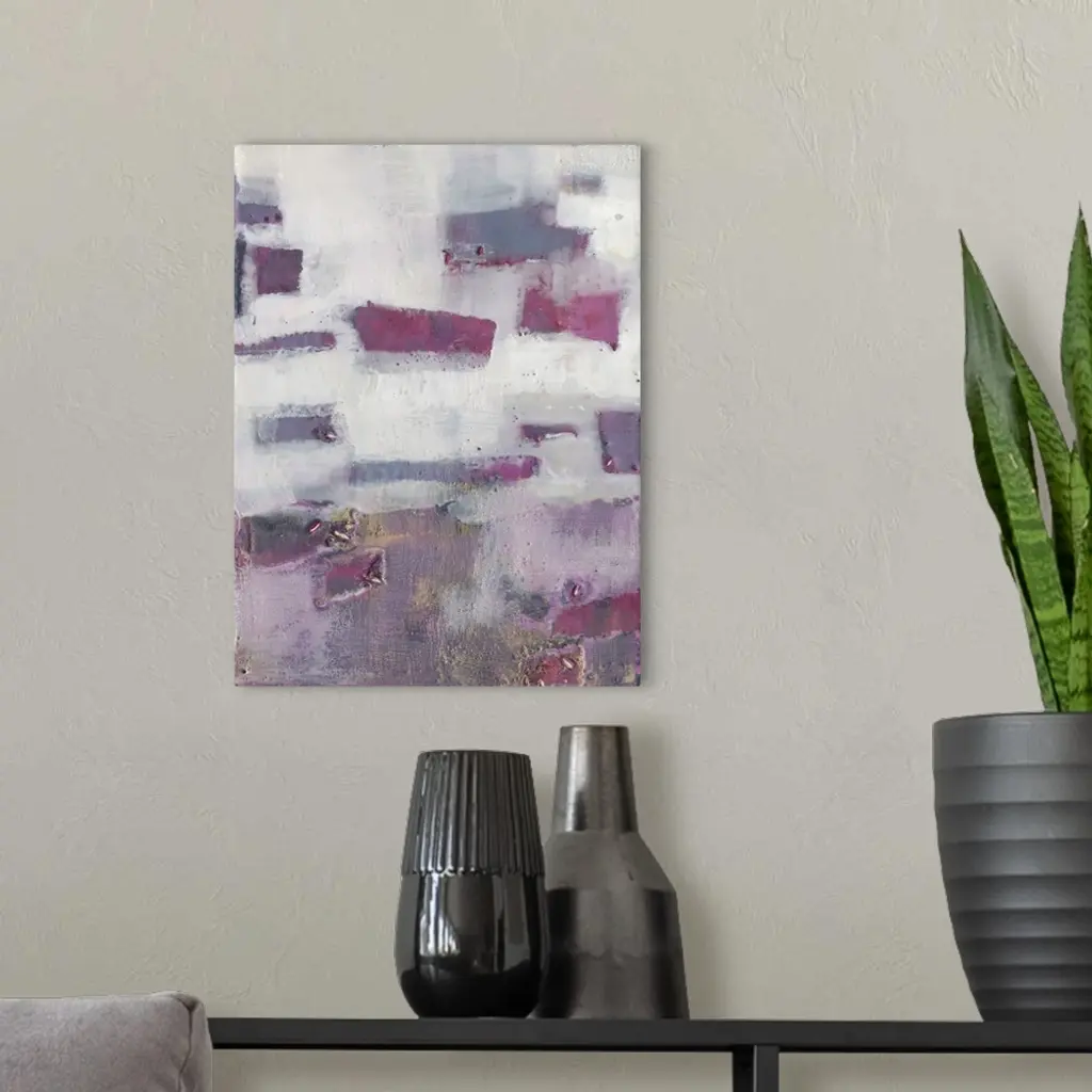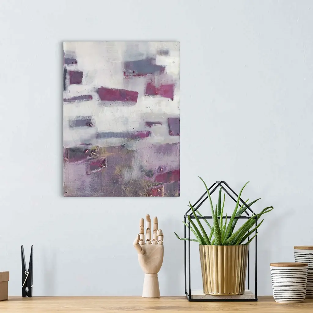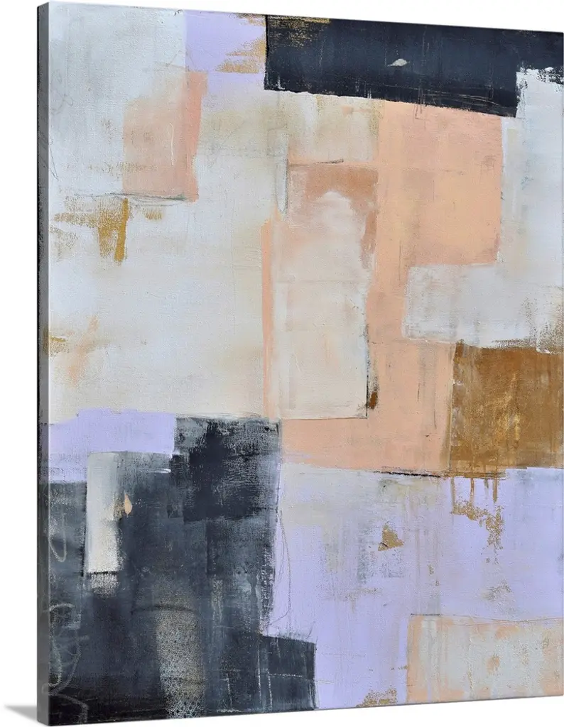 Magenta in blocks of color against milky tones with gold embellishments are featured in this contemporary artwork.