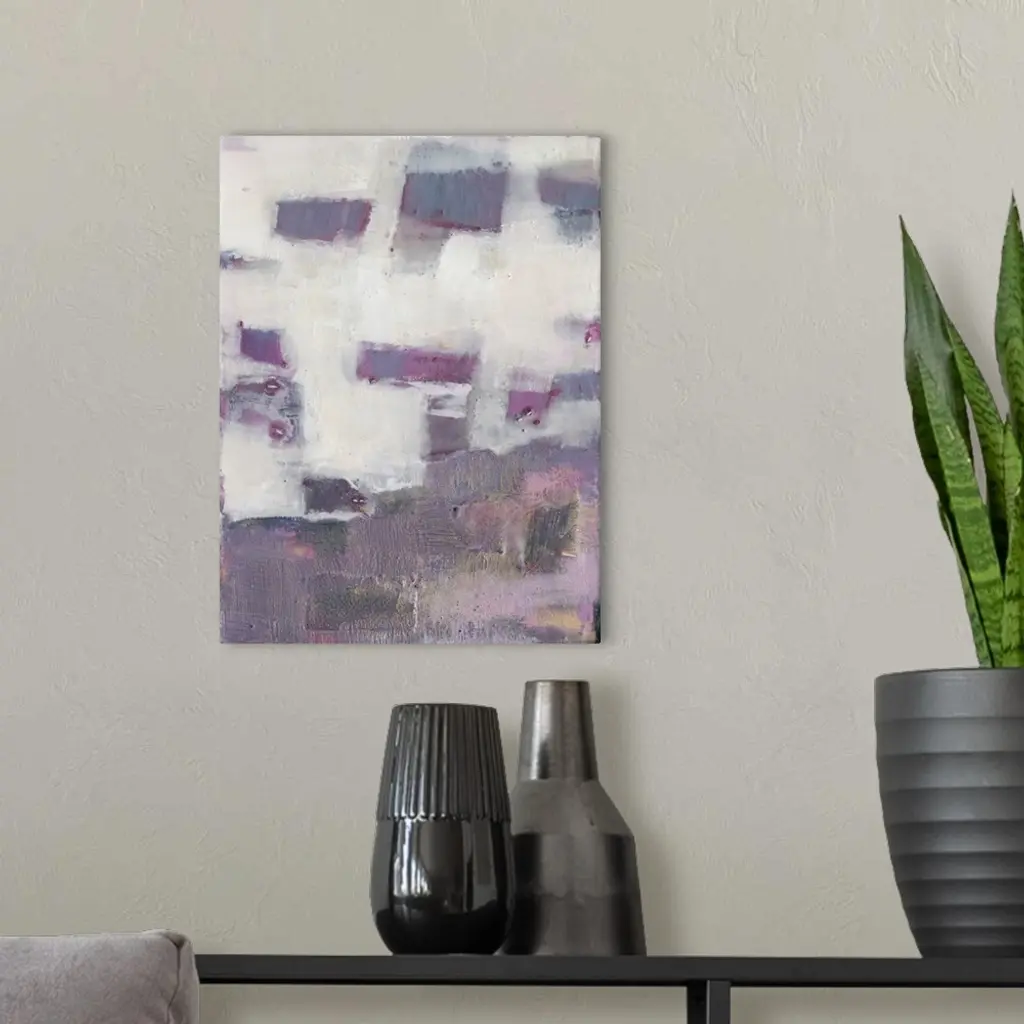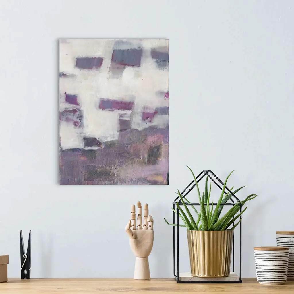 Magenta in blocks of color against milky tones with gold embellishments are featured in this contemporary artwork.