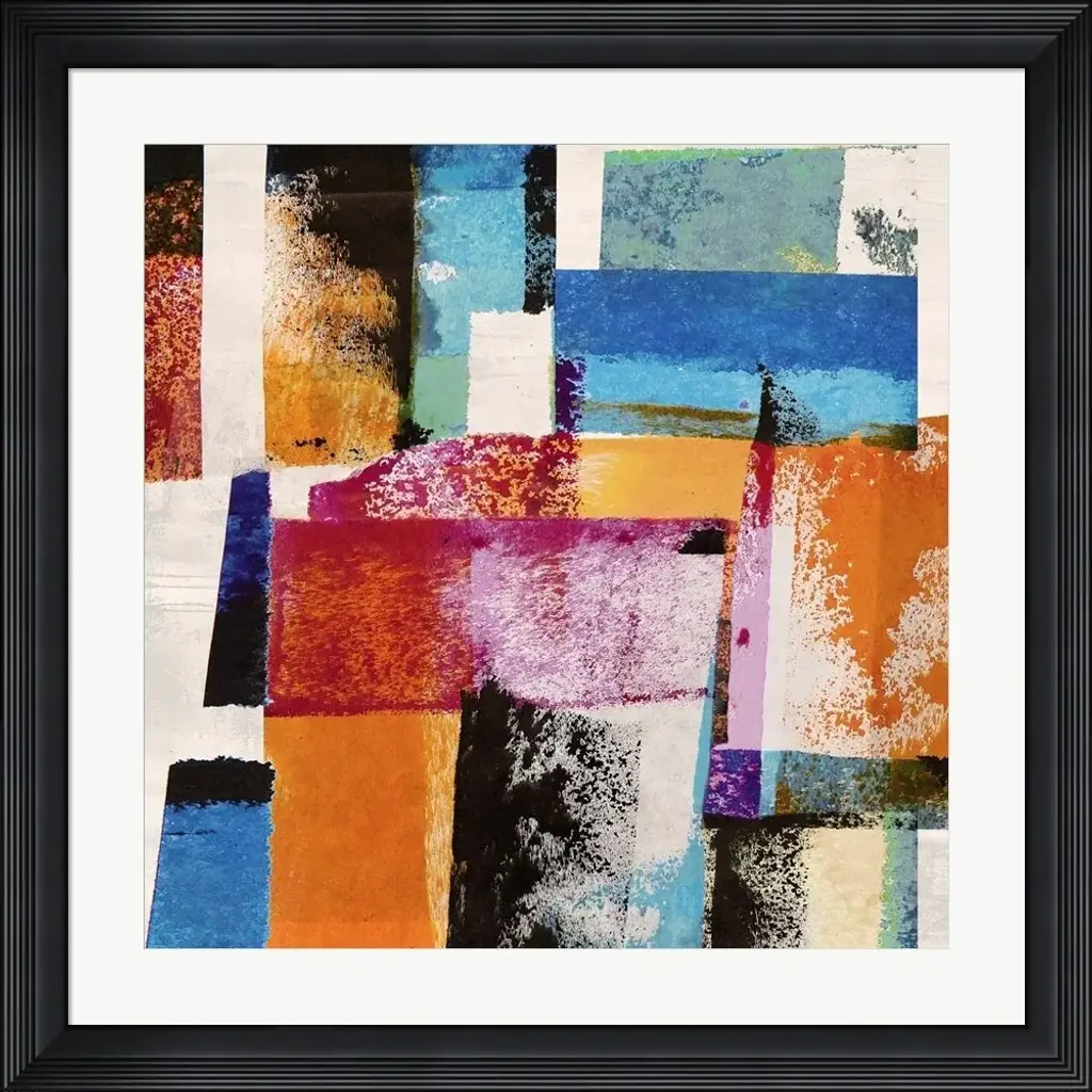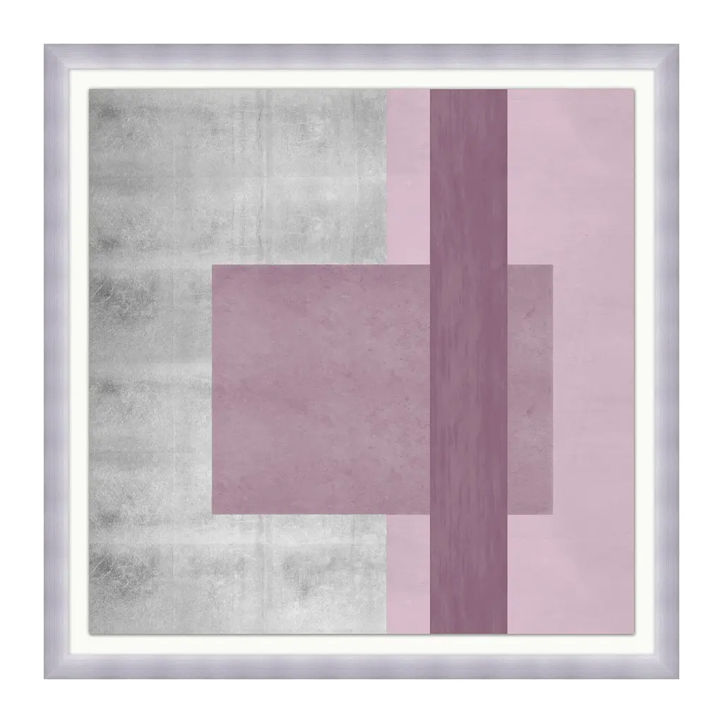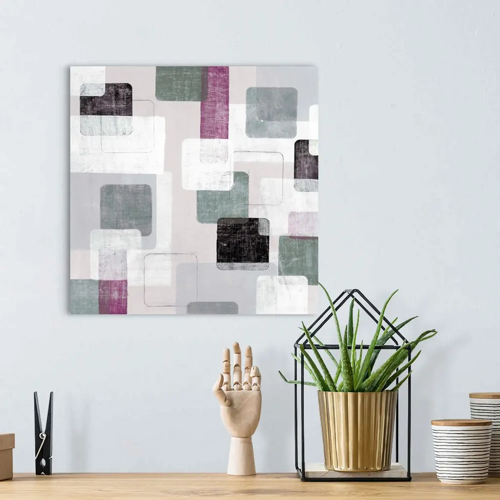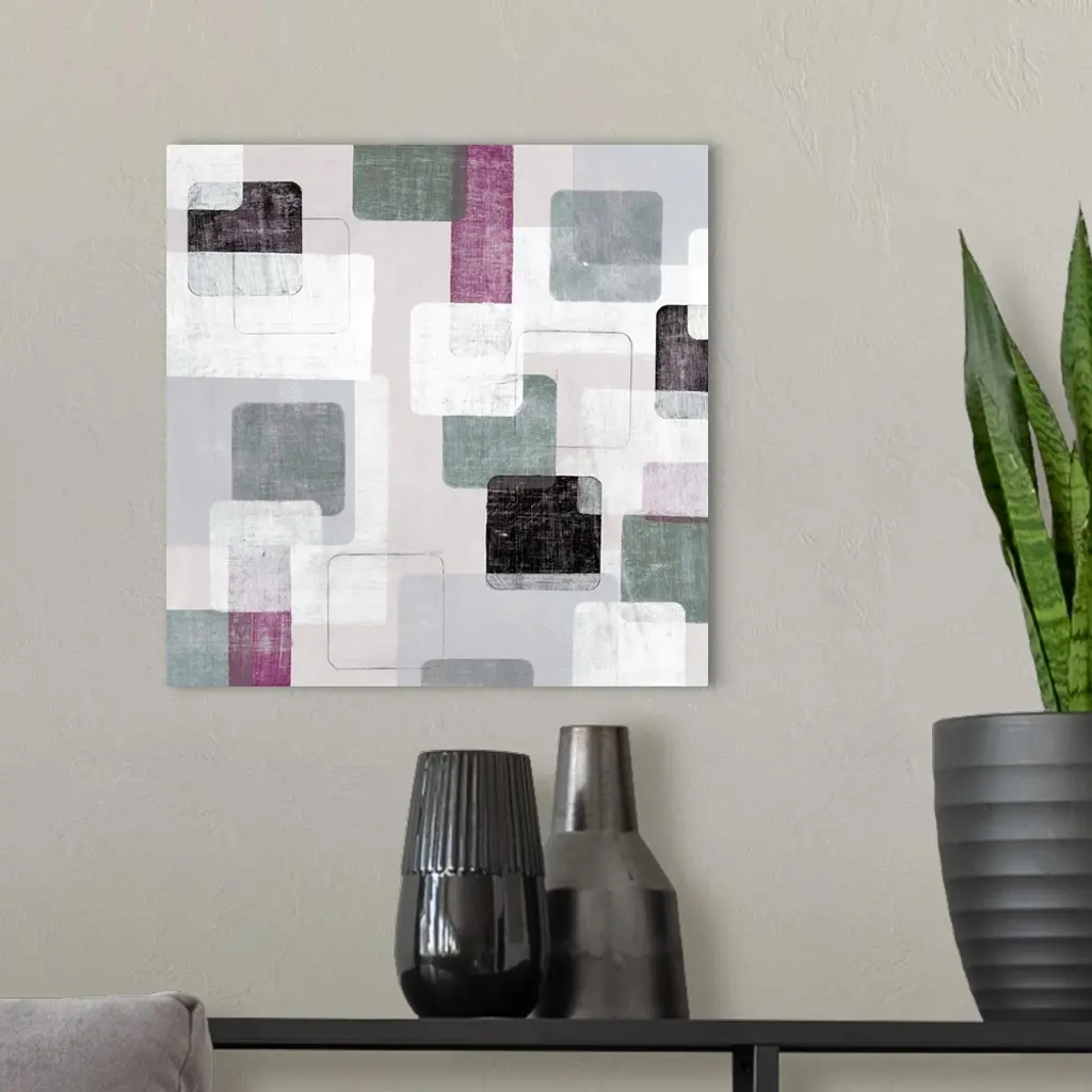 Contemporary abstract painting using soft cornered geometric shapes floating in space against a neutral background.