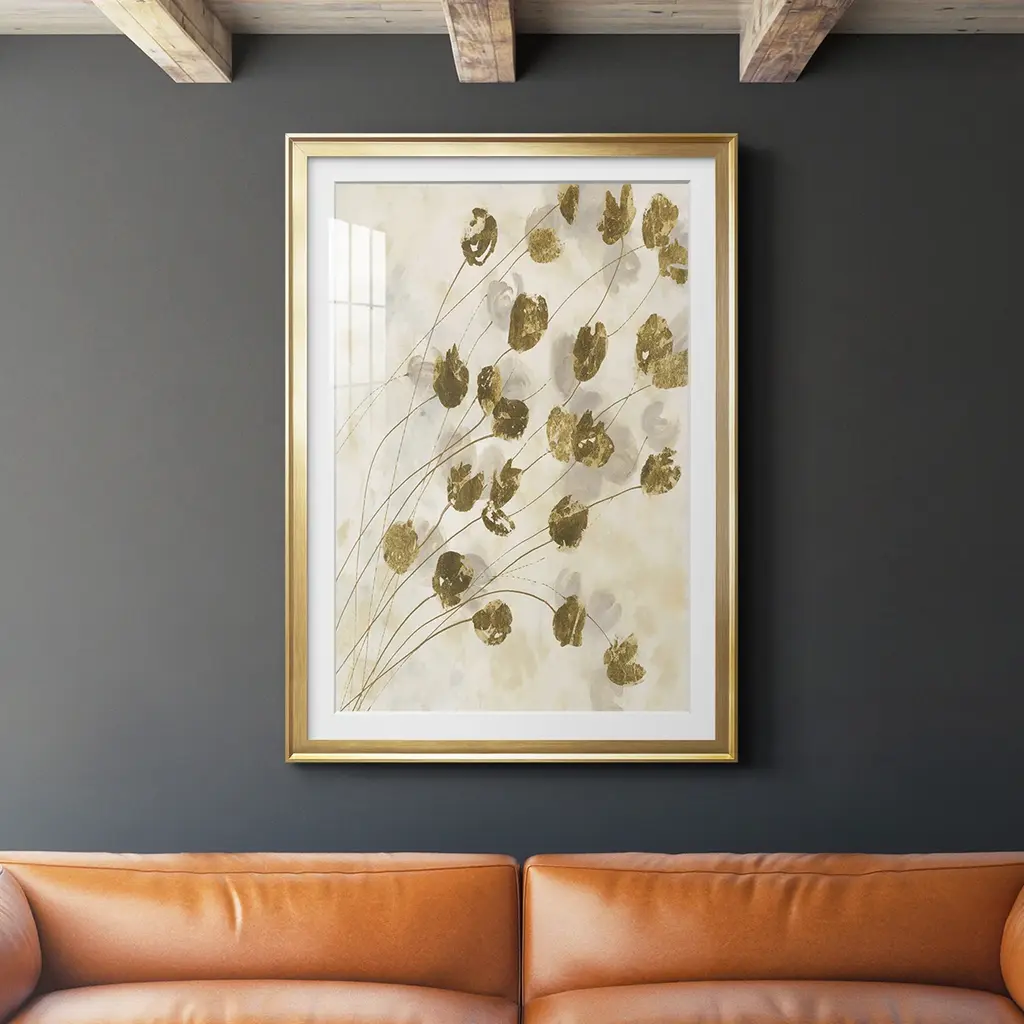 Wildflower Cluster by artist Tim O'Toole is a refined print on paper that showcases delicate, airy florals. The elegant flowers in tan and silver tones are set against a pearl white backdrop, enhanced by a gloss texture gel that adds depth and dimension. The piece is framed in a distressed champagne gallery frame, adding warm golden tones to complete the sophisticated look.
