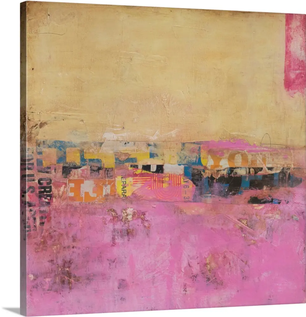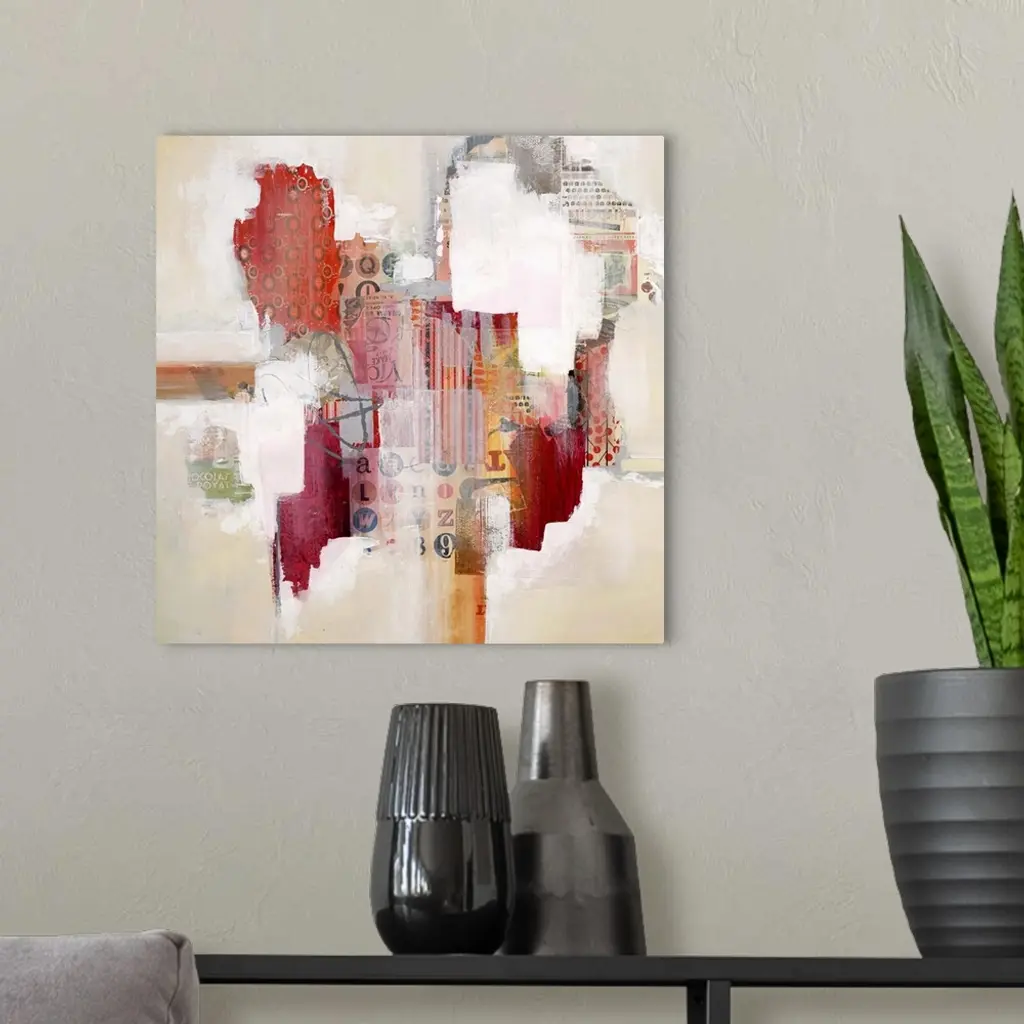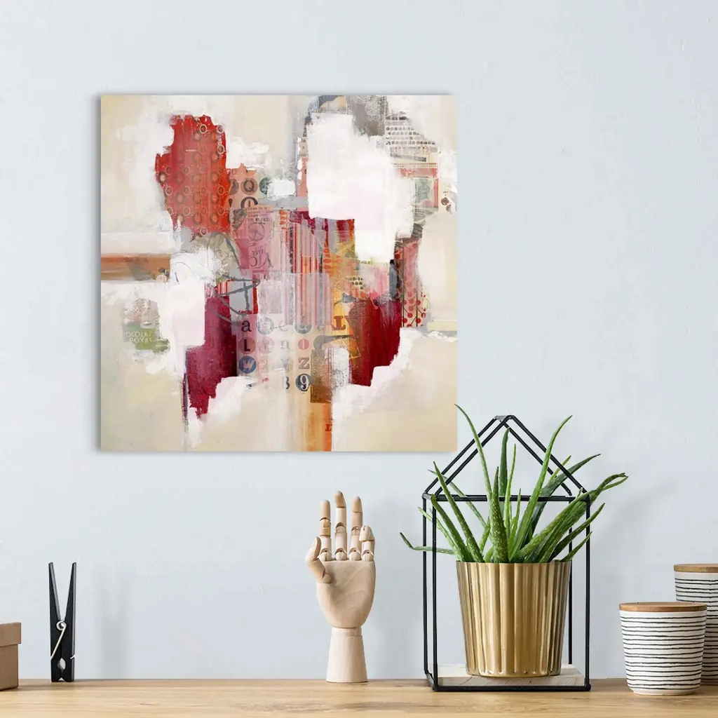Colorful abstract artwork with bright white spaces among red mixed media blocks.
