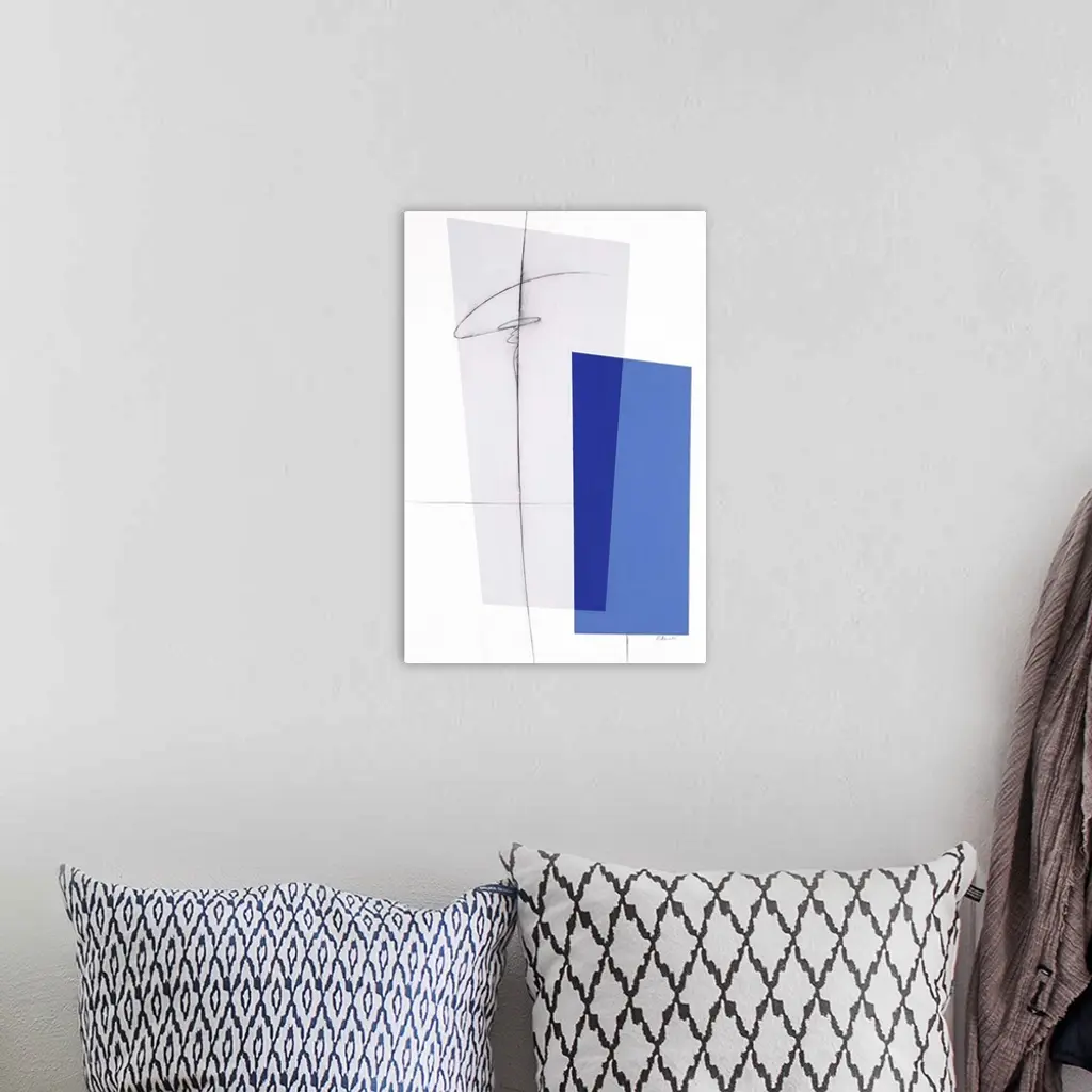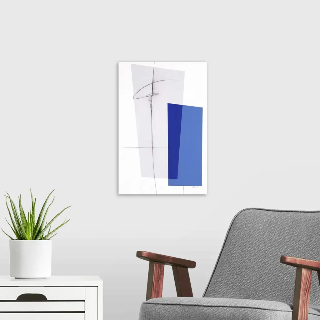 Large geometric abstract painting in shades of blue and gray with thin, black, squiggly lines on top.