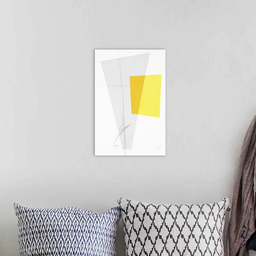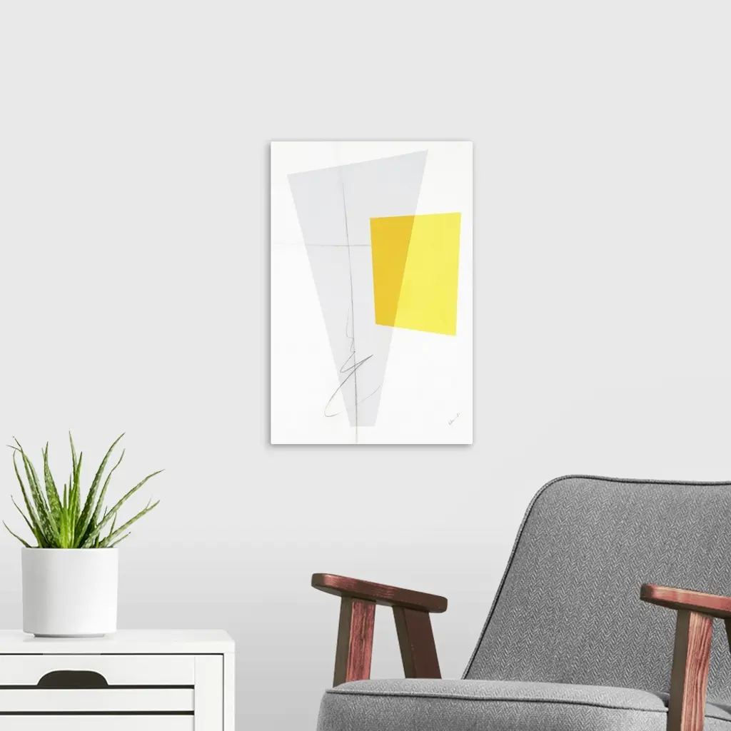 Large geometric abstract painting in shades of yellow and gray with thin, black, squiggly lines on top.