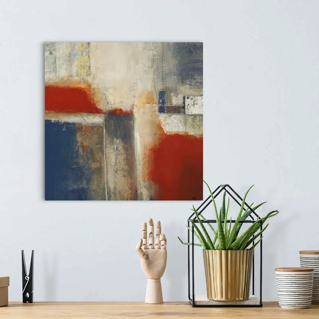 This is a square abstract painting with area areas of layered color and sanded paint textures.