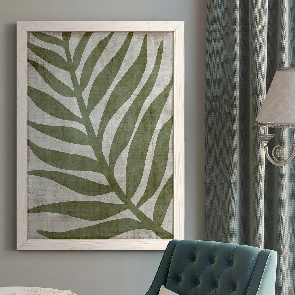 Inspired by mid-century botanical art, Timeless Tropics is a giclée on matte paper of various tropical plant leaves. Each piece has been deckled and floated on a fabric mat with a wood frame in a light brown, walnut finish. This wall art can be styled on its own or as a gallery wall with the coordinating pieces in this collection.