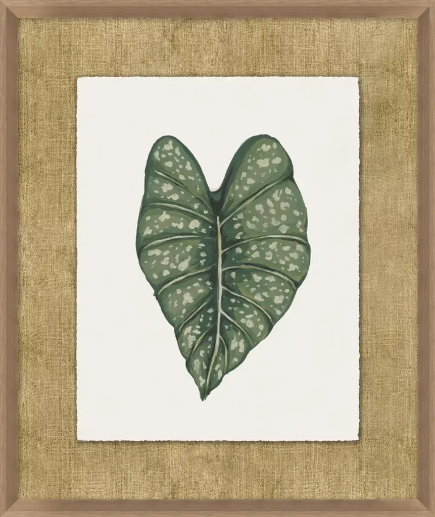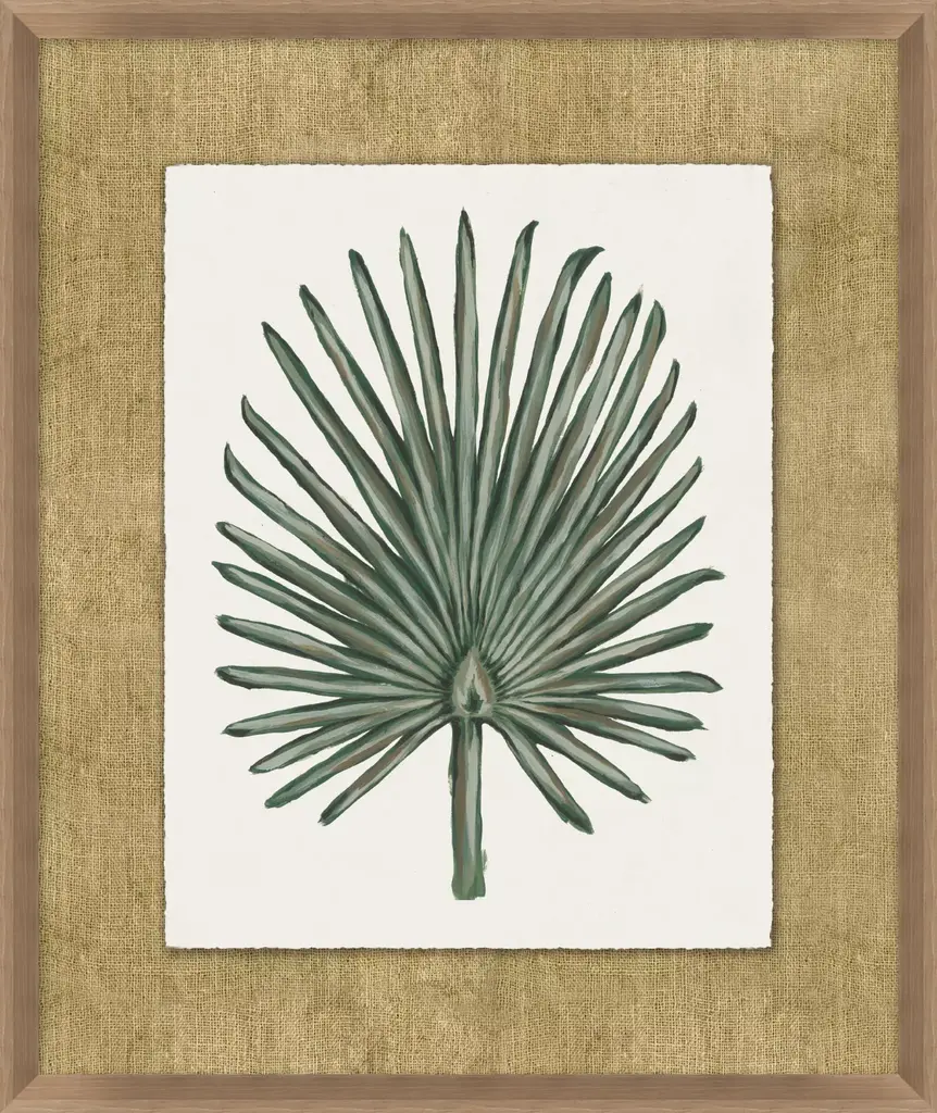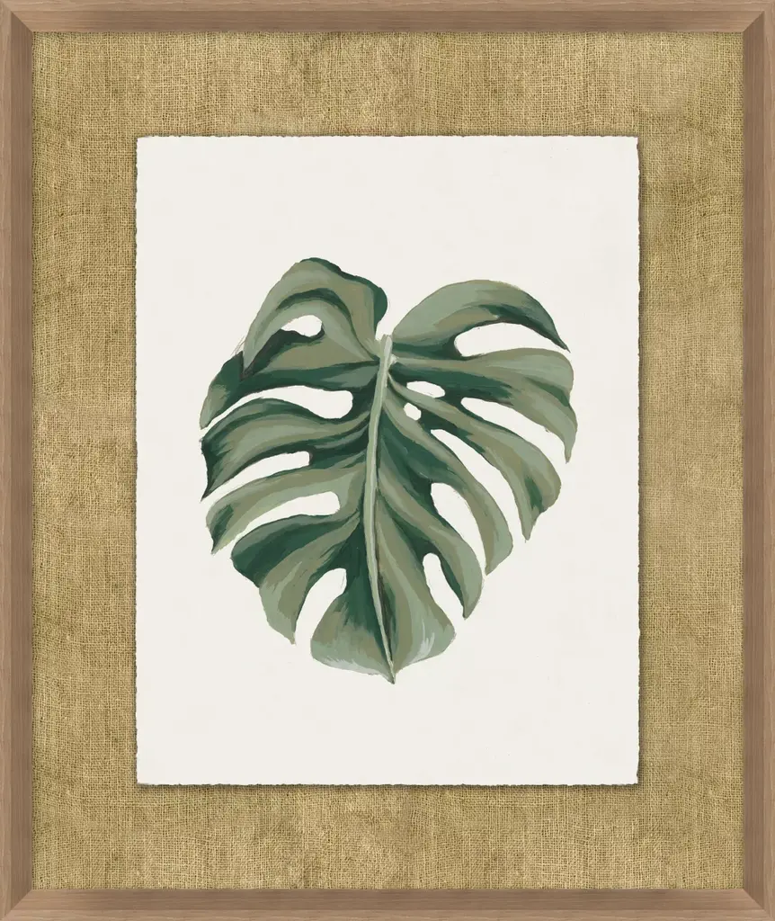 Inspired by mid-century botanical art, Timeless Tropics is a giclée on matte paper of various tropical plant leaves. Each piece has been deckled and floated on a fabric mat with a wood frame in a light brown, walnut finish. This wall art can be styled on its own or as a gallery wall with the coordinating pieces in this collection.