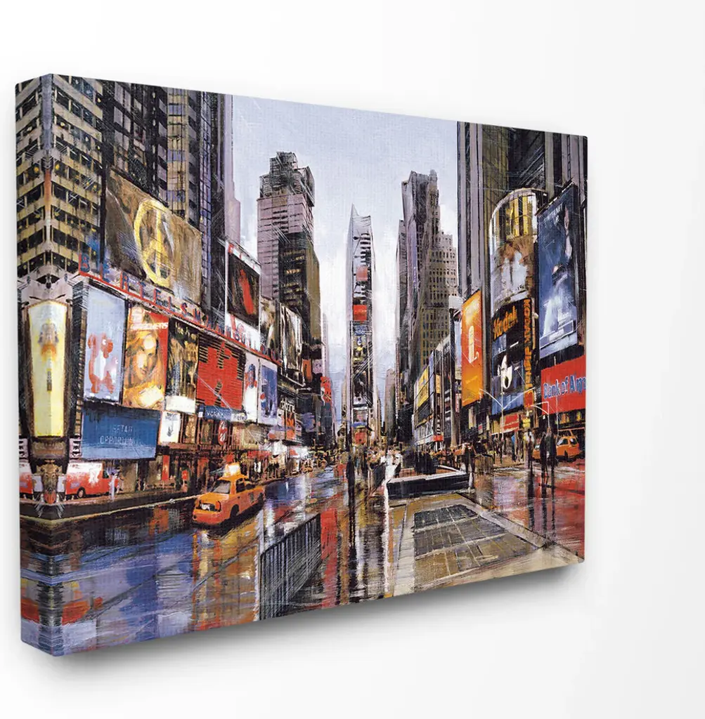 The Stupell Home Decor Collection Times Square Crowds on a Rainy Day Painting Oversized Stretched Canvas Wall Art, 24 x 1.5 x 30, Proudly Made in USAModern and Trendy is great and all, but sometimes there is nothing like a timeless piece. This is an example of an item from our newly curated Classic Collection. Proudly made in the USA, our stretched canvas is created with only the highest standards. We print with high quality inks and canvas, and then hand cut and stretch it over a 1.5 inch thick wooden frame. The art comes ready to hang with no installation required. Not to mention, at this size, it is sure to be the focal point of any room!